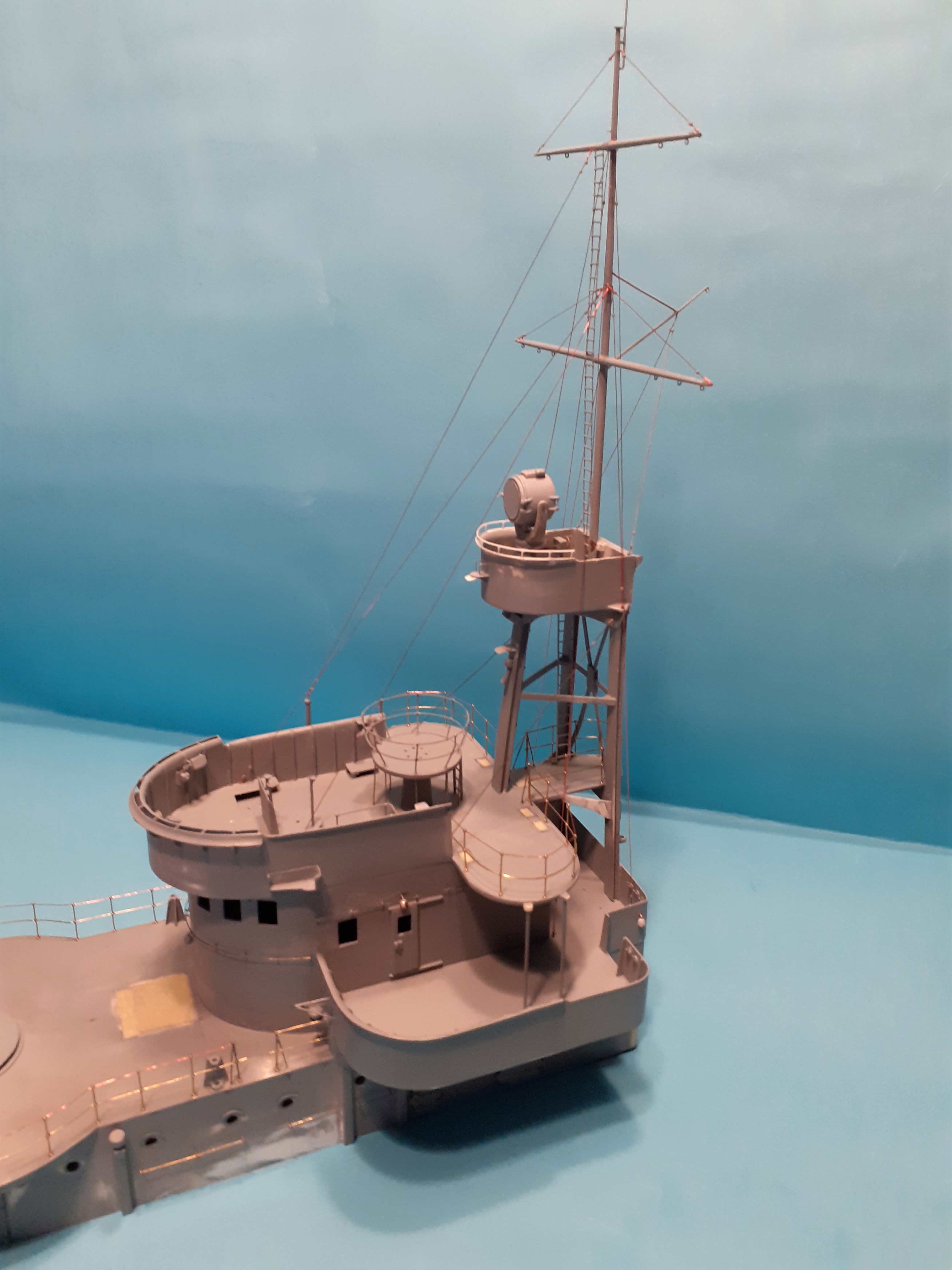 Pomimo poślizgów i częściowych napraw przez zgrabiałe paluchy, powolutku do przodu. Ciąg dalszy głównej nadbudówki, relingi ukończone w 90 procentach, zamontowany reflektor. Do malowania pozostało mi zamontować drabinki wejściowe i część olinowania stałego masztu.