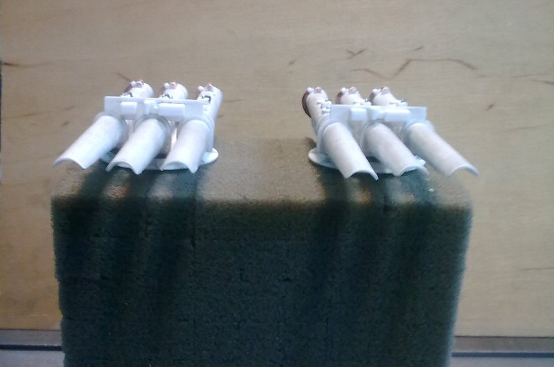 Powolutku do przodu, ale niestety nie w takim tempie jakby to sobie każdy życzył. Nadzieją są jesienno-zimowe wieczory na modelowanie, ale do rzeczy. Dalej męczę wyrzutnie torped. Połączyłem rury z podstawami więc coraz trudniej dla moich zgrabiałych paluchów. Przepraszam też za jakość zdjęć bo narazie jestem zmuszony robić telefonem.