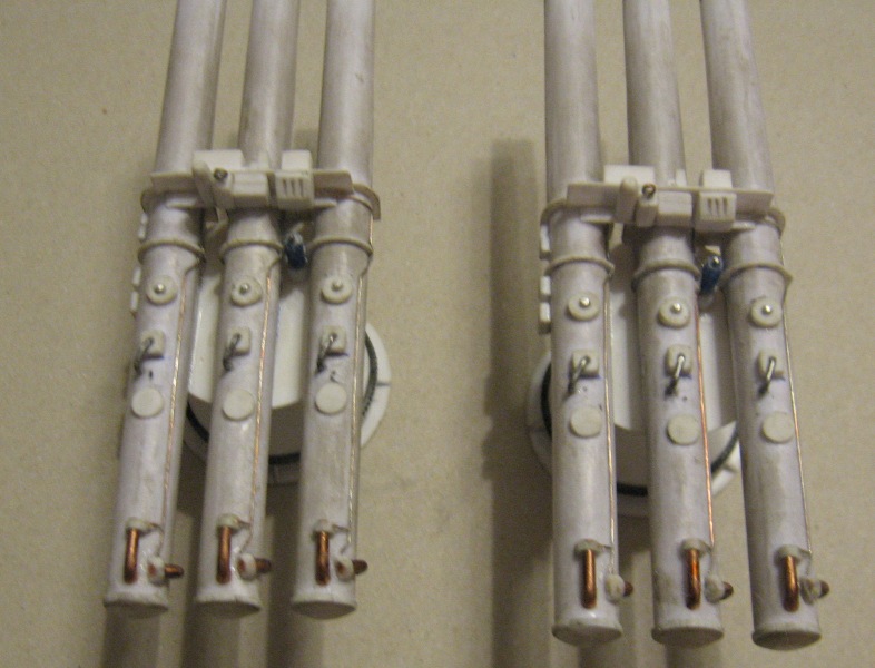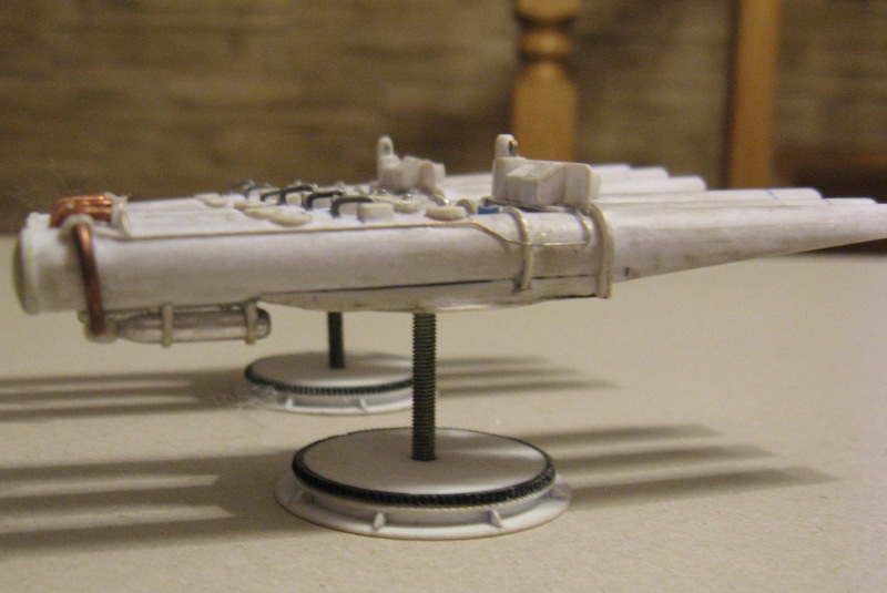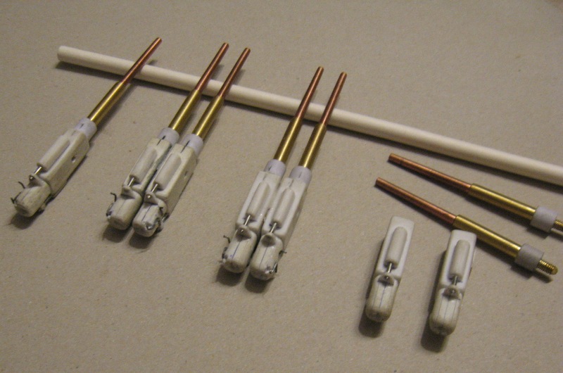 Troszkę coś z doskoku podłubię. Przy wyrzutniach przybyło niewiele drobnicy, ale dlatego że resztę postanowiłem kleić po zagruntowaniu. W między czasie robię kolejne detale, żeby przygotować ich jak najwięcej do malowania podkładem. Postanowiłem zmierzyć się z armatami. Narazie wyglądają troszkę topornie ale wymagają dopieszczenia. Zresztą oceńcie sami.
