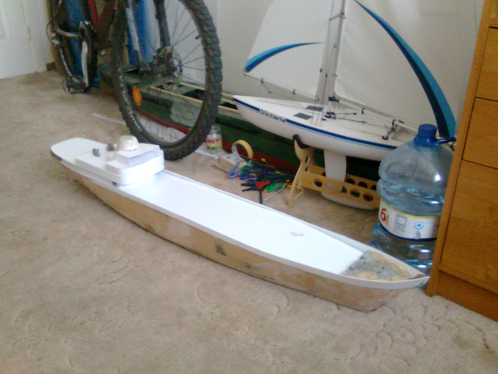Dużo czasu upłynęło od umieszczenia pierwszego wpisu a w modelu prawie nic się nie zmieniło i nic nie przybyło. Gównie przez brak pomysłu jak rozwiązać problemy i wątpliwości dotyczące dalszej budowy. Obecnie mam zamiar zrobić nadburcia i pokład, potem powinno już pójść płynniej, bo dalsza praca będzie opierać się już głównie na planach modelarskich. Na dzień dzisiejszym plan jest taki: z podkładów pod panele pokładowe zrobiłem coś na obraz szablonu. wyznacza mi on wysokość nadburć oraz posłuży mi do wykreślenia pokładu. Chciałem nadburcia wykoć z forniru, mam taki 0,6mm, okleiłem już nawet dziób, jednak fornir pod wpływem wilgoci z kleju pofalował się i obecnie zrywam nadburcie i zamierzam wykonać je ze spienionego PCV w grubości 1mm. Po tej operacji cały kadłub, wraz z nadburciem, zamierzam pokryć laminatem z płótna szklanego o gramaturze ok. 40g/m2. Na poniższych zdjęciach widać jak model wygląda na chwilę obecną. Mam tez do Was pytanie, gdzie kupujecie wały napędowe? Model ma swój stary wał, jednak rurka, która służyła do wtłaczania w pochwę wału smaru, ułamała się. Nie wiem czy ja lutować, czy też kupić kompletny wał z przegubem, przekładnią i silnikiem, zwłaszcza, że nie mam silnika jeszcze.