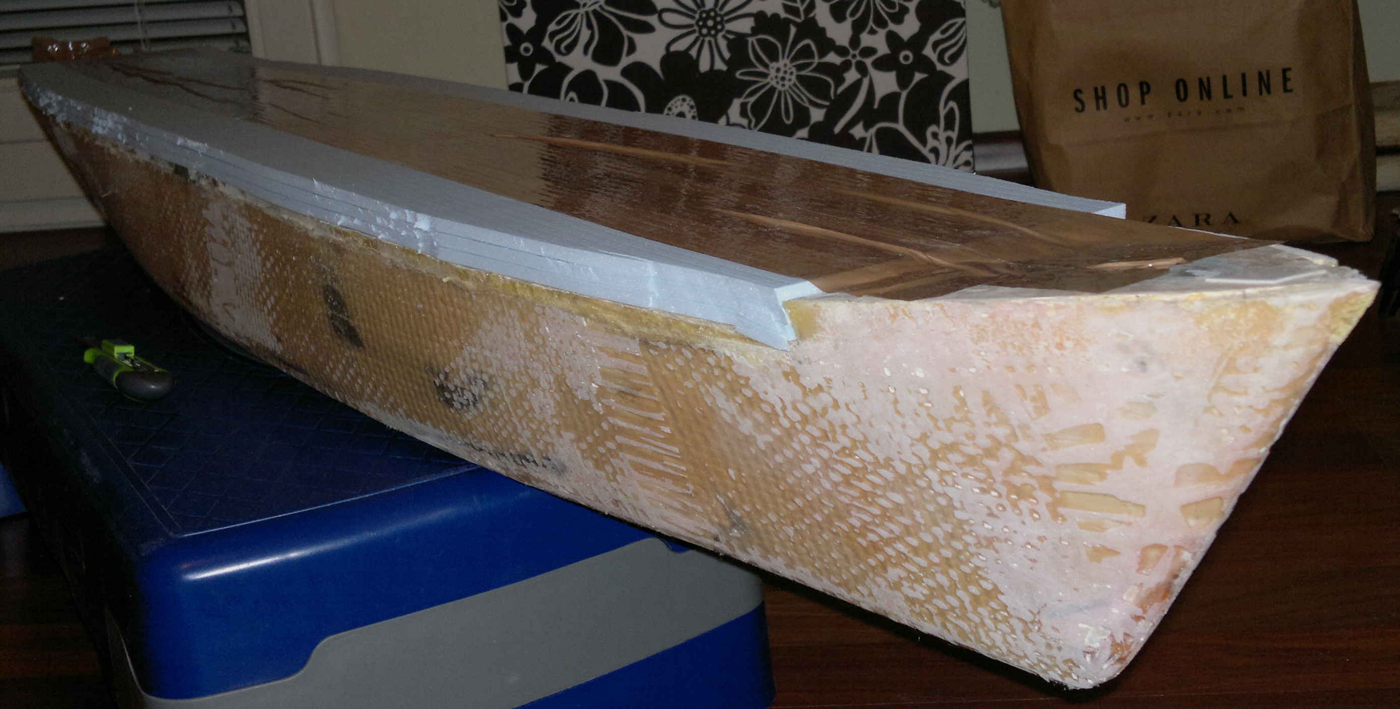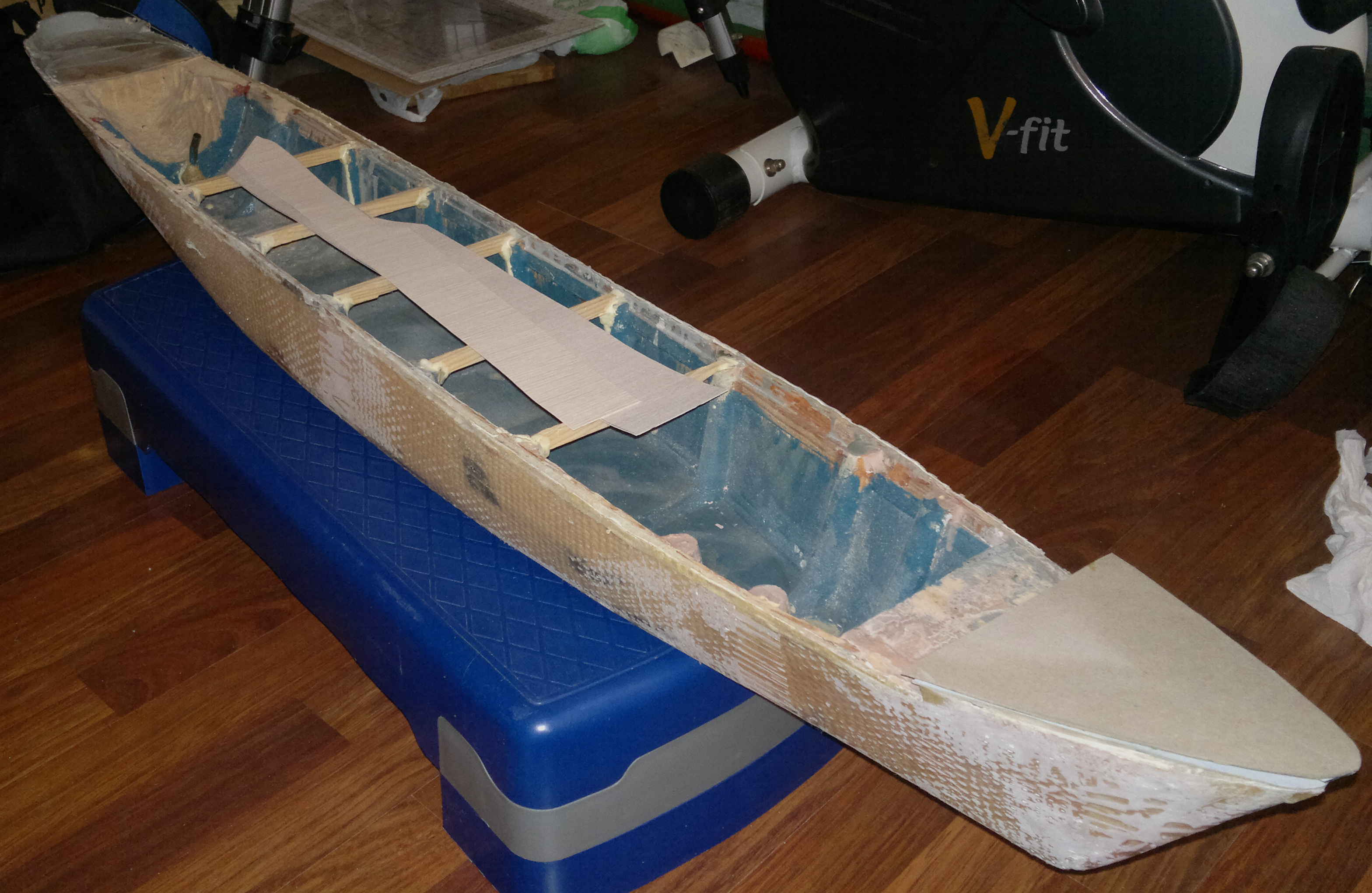 Kadłub z formatowymi nadburciami, jeszcze nie zamontowanymi. Niestety, dziś już wiem, że nadburcie z forniru nie sprawdziło się, a szkoda.