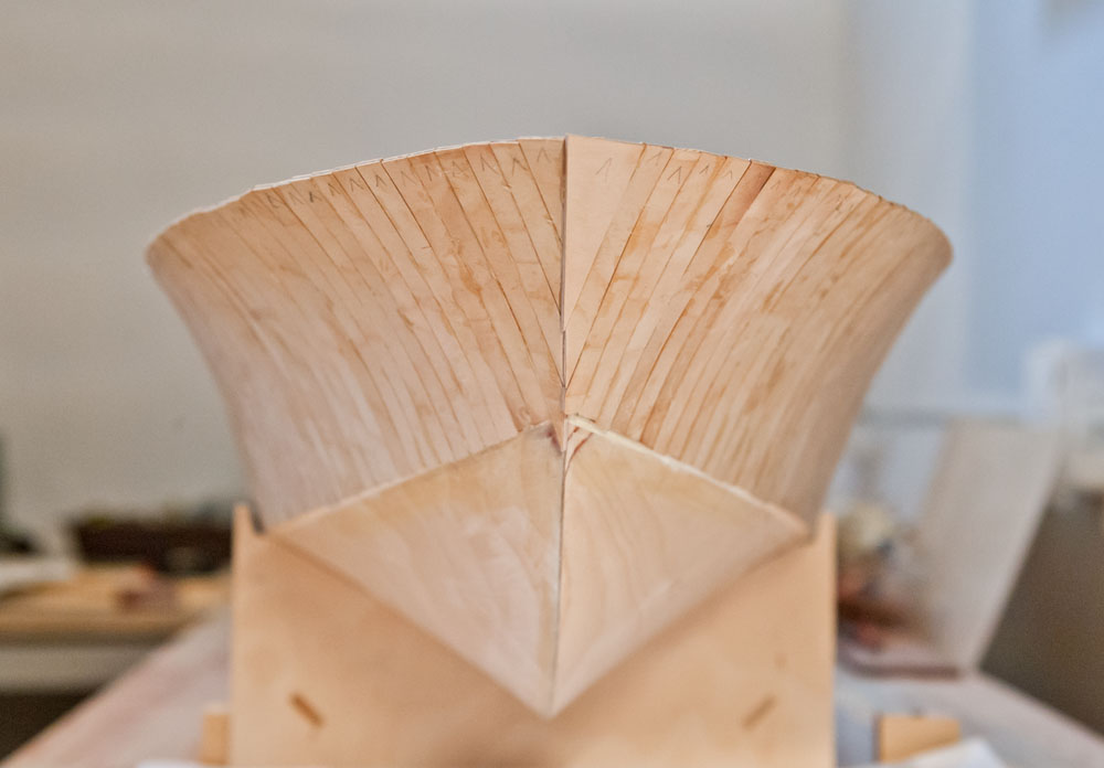 jeżeli ten model ma pływać ( chyba z tą myślą go budujesz) to raczej odpuść sobie kleje meblowe (między innymi topliwy stosowany na obrzeża. W meblarstwie są trochę inne wymagania co do klasy wodoodporności. Zrób testy z fornirem, ale węższym (~10 mm) klejonym na kleje poliuretanowe np. SUDAL 66A. Docisk listwą z naklejoną gąbką i folią rozdzielającą lub workiem foliowym z pompą próżniową.