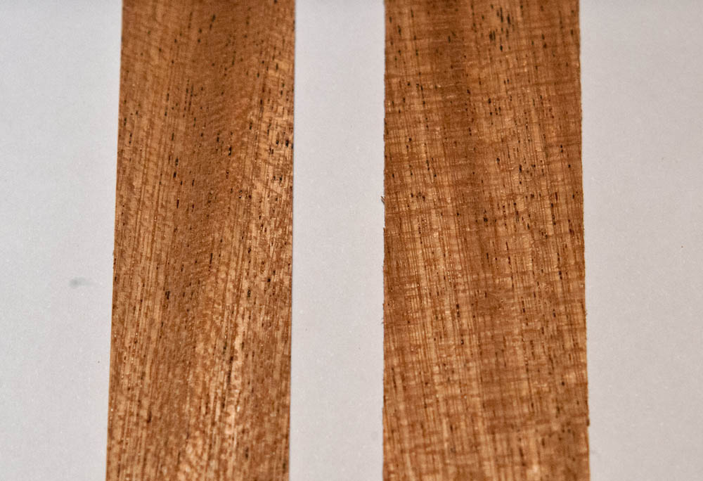 Gotowe obrzeża miewają wady krawędzi, co powoduje powstawanie przy klejeniu postrzępionych szczelinek między paskami. Po prawej obrzeże z niebciętymi krawędziami.