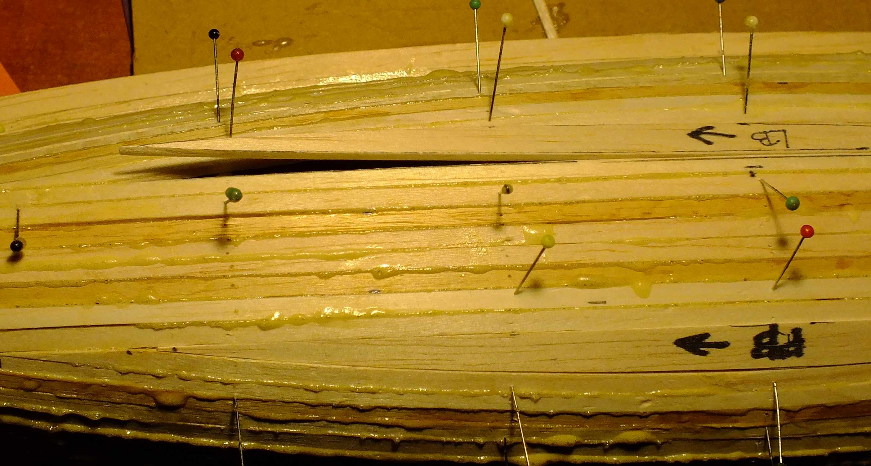 Pierwszy etap budowy kopyta/kadłuba dobiegł końca. Ostatnie dwie klepki dopasowane i wklejone. Po utwardzeniu się spoiny będzie można odstawić na kilka dni kadłub do uleżenia się, lub jak kto woli do wysezonowania. Chodzi o zminimalizowanie naprężeń w kadłubie przed ostatecznym szlifowaniem.