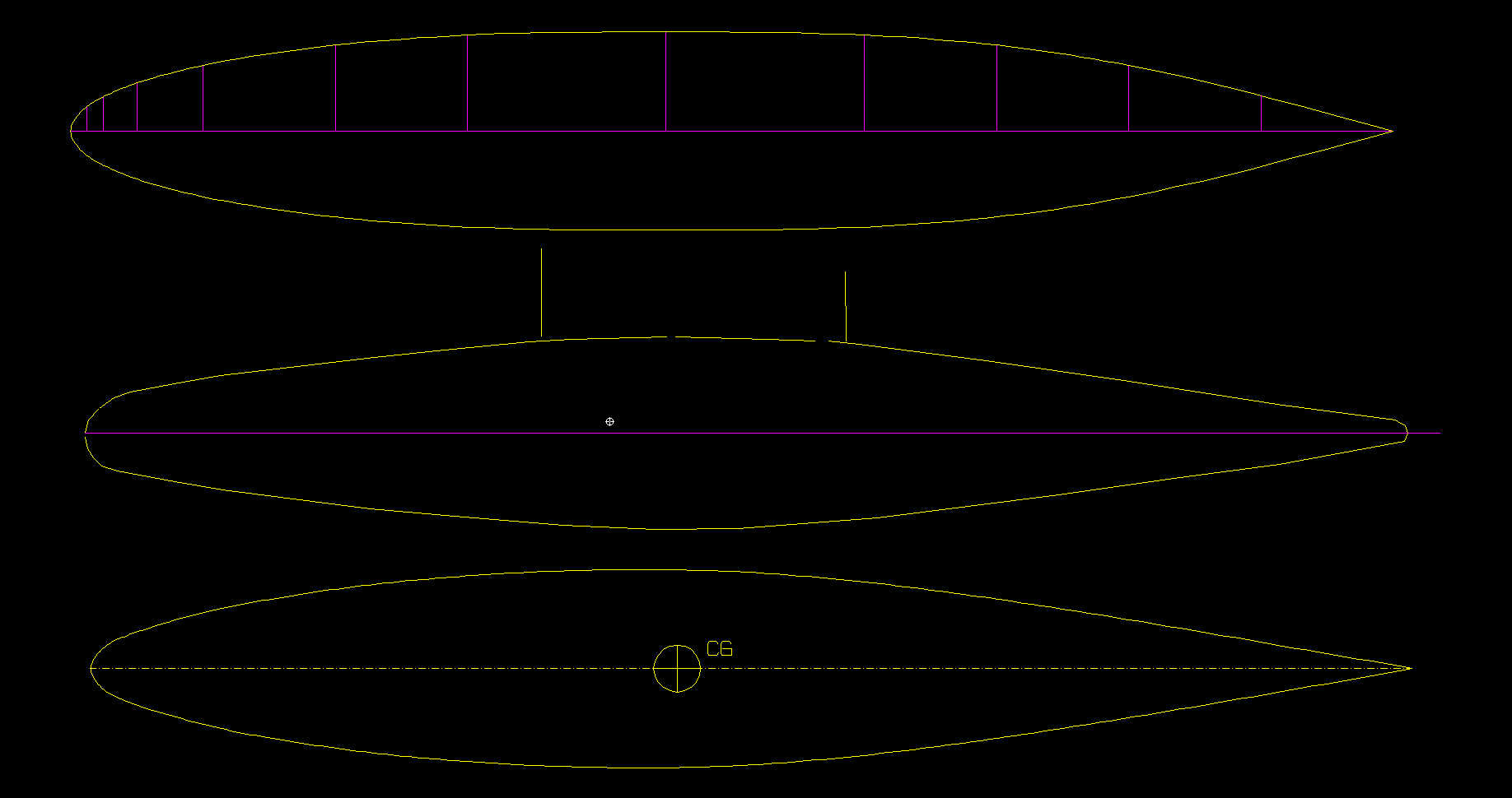 Płetwa: powierzchnia płetwy powinna pozwolić na zrównoważenie siły pochodzącej od żagli. To łatwo policzyć. Analizując biegunowe profili stosowane w płetwach i licząc współczynnik doskonałości można zauważyć że optymalny kat natarcia jest zawarty od 2- do 4 o. Prędkość opływu można przyjąć na poziomie 0.8-09 prędkości krytycznej (bariera falowa). To już tylko krok do określenia powierzchni płetwy. Co do kształtu, obrys prostokątny powszechnie stosowany jest punktem wyjścia. Jeden z oporów generowanych przez skrzydło to opór indukowany. Optymalny kształt to obrys eliptyczny, w awiacji często stosowany, tu kłopotliwy z uwagi na mocowanie balastu na samym końcu. Jak łatwo zauważyć środkowa płetwa jest w górnej częsci zbliżona do elipsy, rozszerza się tylko do c=35 w miejscu mocowania bulba.