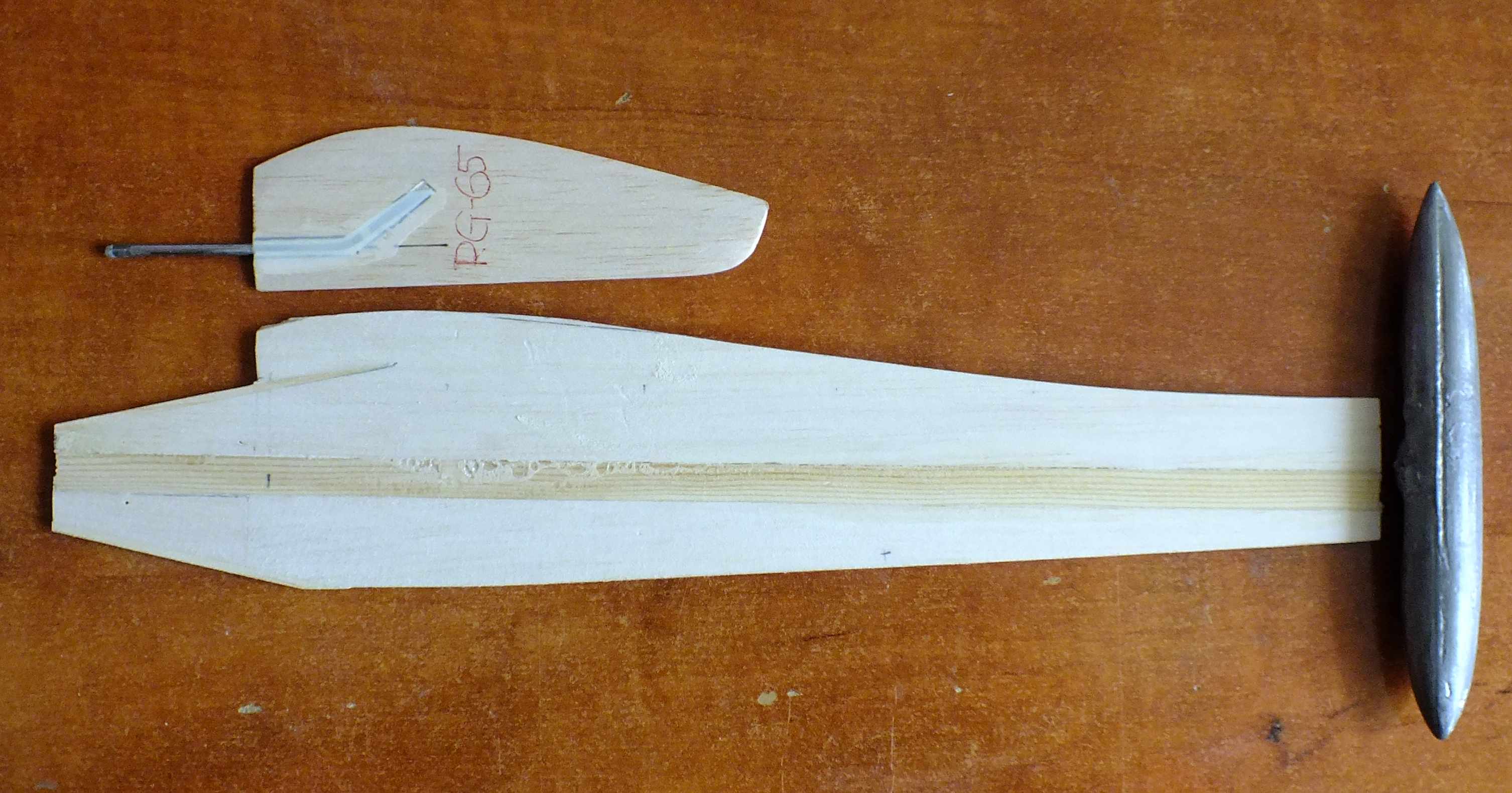 W sporej części modeli tej klasy płetwa "balastowa" jest wykonana z płaskownika duralowego. Ja zdecydowałem się na troszeczkę inna konstrukcję: rdzeń balsowy, dźwigar sosnowy 4*10 i płaszcz laminatowy na rdzeniu. Kanapka. Płetwa jest dzięki temu bardzo lekka. Testowałem płetwę sterowa o bardzo podobnej konstrukcji, efekty na zdjęciu. Nóż tokarski obciążający końcówkę płetwy ma masę 1/3 kg. Płetwa nie ma dźwigarka sosnowego. Płetwa w stanie takim jak na zdjęciu ma masę aż: 4g.