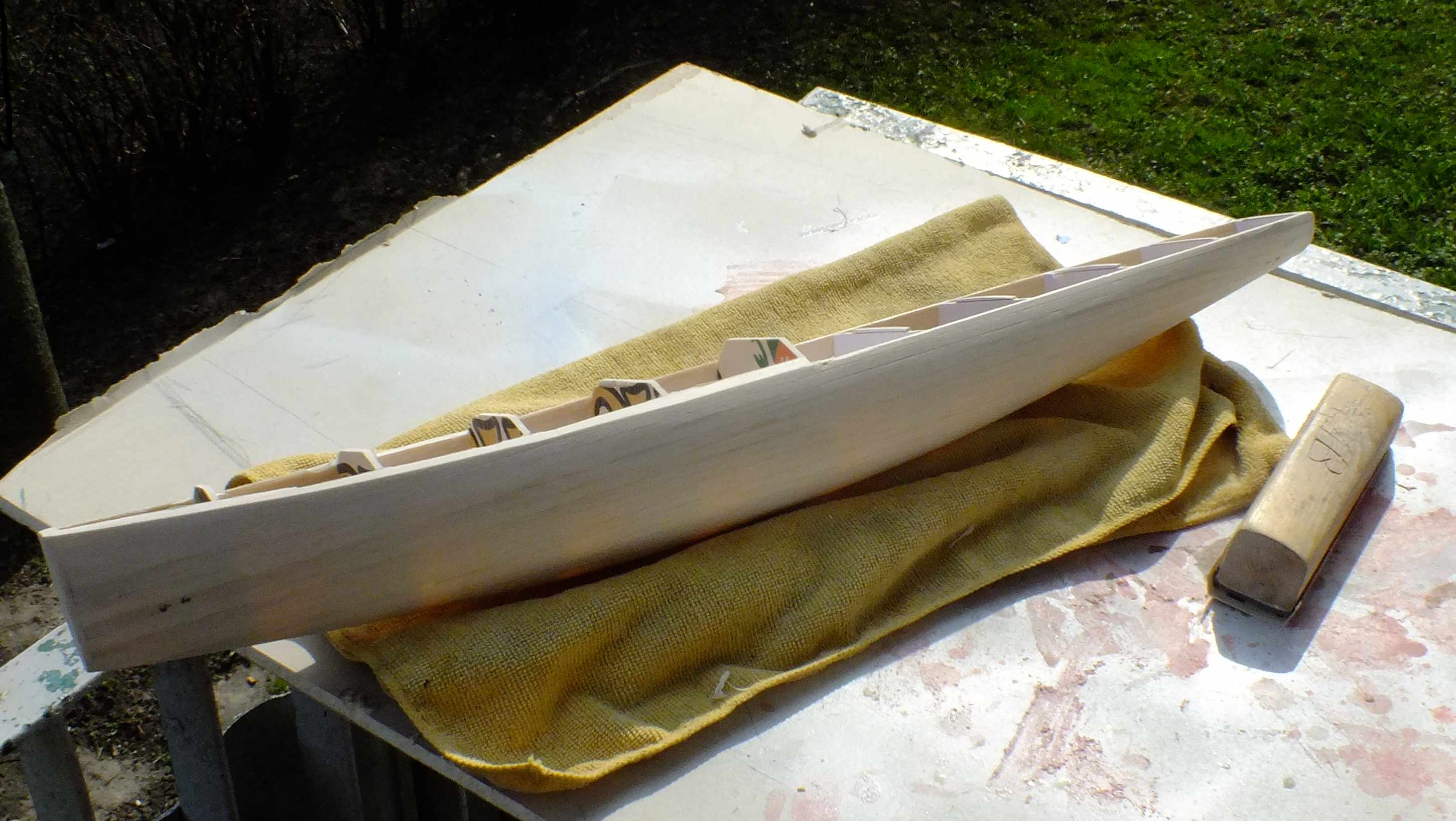 Na poczatku marca powstały linie jeszcze jednego jachciku tej klasy. "Ładność" linii i parametry kadłuba sprawiły, że postanowiłem budować równolegle dwa modele tej klasy. Mając trochę zapasów balsy 3.0 zrobiłem szablony, skleiłem w heling i zacząłem modelować "łódź podwodną". Kadłub jest niski i wąski i z racji przekrojów zbliżonych do okrągłych trochę ją przypomina. Nie zakładałem wykorzystania kopyta jako przyszłego kadłuba, pozwoliło to na zmianę kleju użytego do klejenia klepek. Zwykły Patex do drewna (biały). Na etykiecie jest co prawda napisane "wodoodporny", ale klasa wodoodporności raczej nie za bardzo szkutnicza. Ten drugi model będę oznaczał jako NSS.