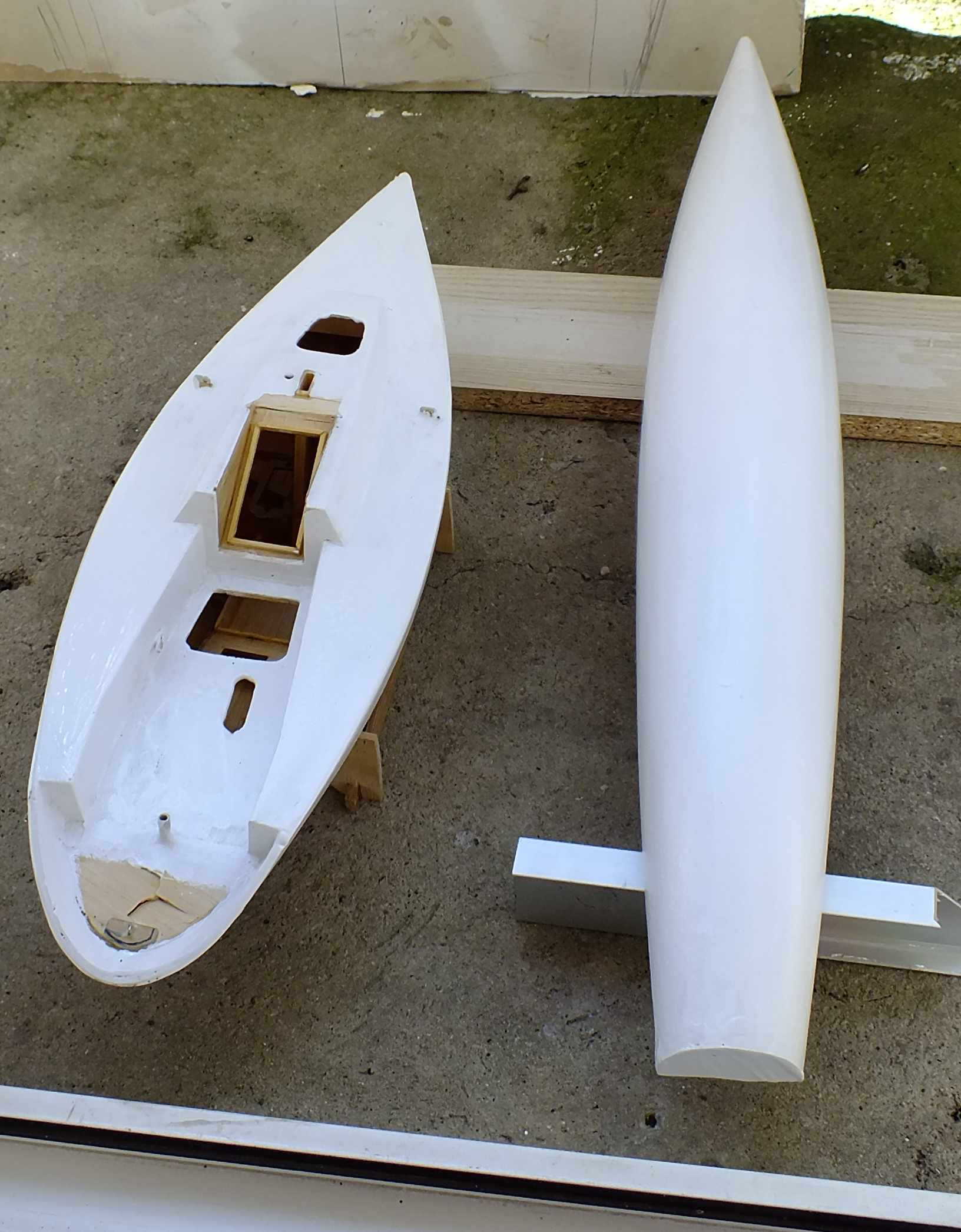 A w RG oba kadłuby powolutku przygotowuję do formowania. #01 otrzymał pierwszą warstwę podkładu, #2 drugą. Jako podkład używam lakieru poliuretanowego (OLIWA) ze sporym dodatkiem talku. Po szlifowaniu wygląda to następująco.