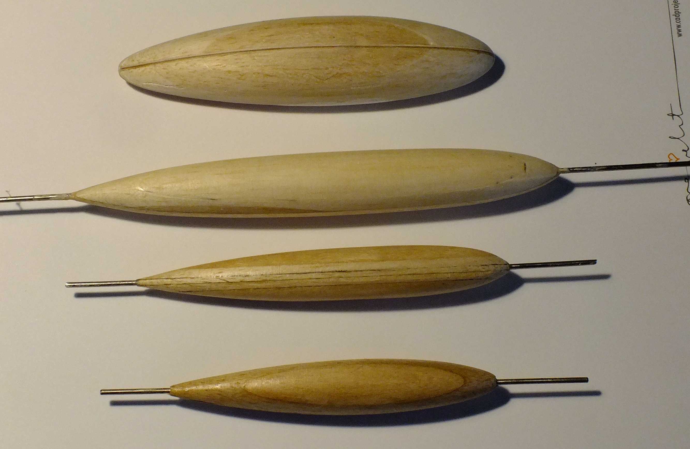 Bardzo ładny bulb (bulba). Nie mam pojęcia jak się powinno pisać. Kształtem przypomina mi profil z serii NACA 65 xxxx. Na rysunku pozwoliłem sobie odrysować Twój bulb, poniżej umieścić NACA 65_015 i powyżej mój profil. W pierwszym MINI zastosowałem, asymetryczny profil, jego model to ten "jajowaty" na górze zdjęcia. Poniżej model bulba do drugiego MINI i być może do RG 65. To mój własny profil trochę wzorowany na lini NACA 16. Na dole najbardziej klasyczny kształt.