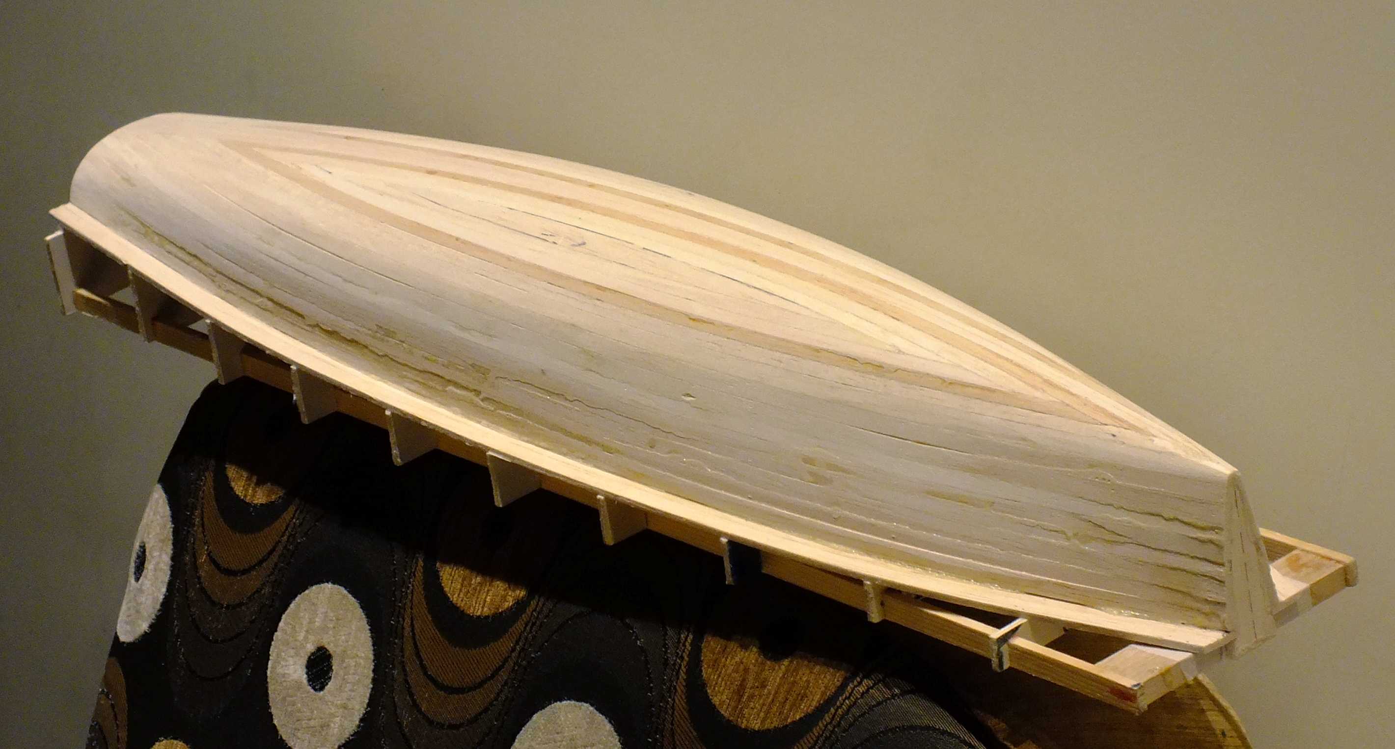 Pierwszy etap budowy kopyta/kadłuba dobiegł końca. Ostatnie dwie klepki dopasowane i wklejone. Po utwardzeniu się spoiny będzie można odstawić na kilka dni kadłub do uleżenia się, lub jak kto woli do wysezonowania. Chodzi o zminimalizowanie naprężeń w kadłubie przed ostatecznym szlifowaniem.
