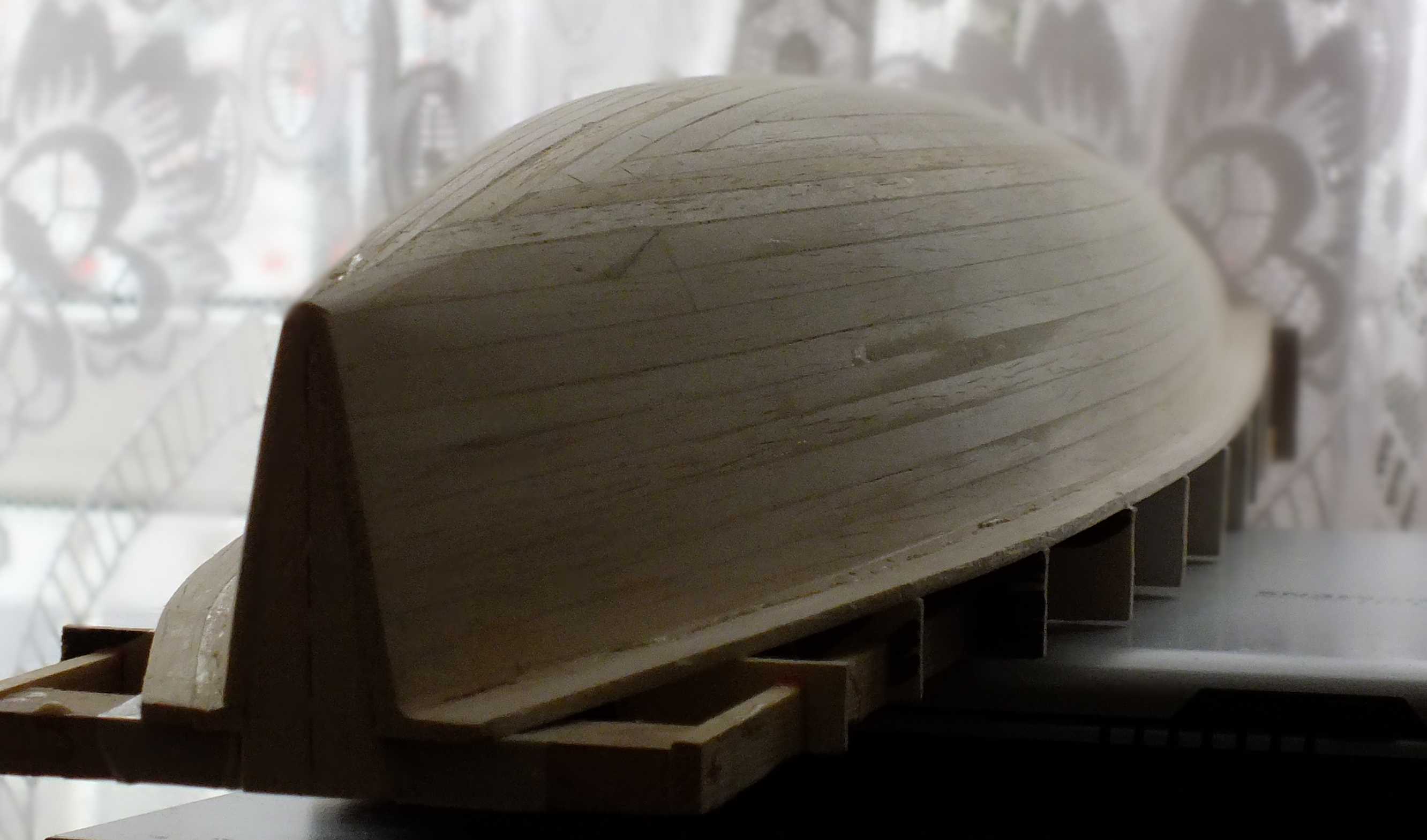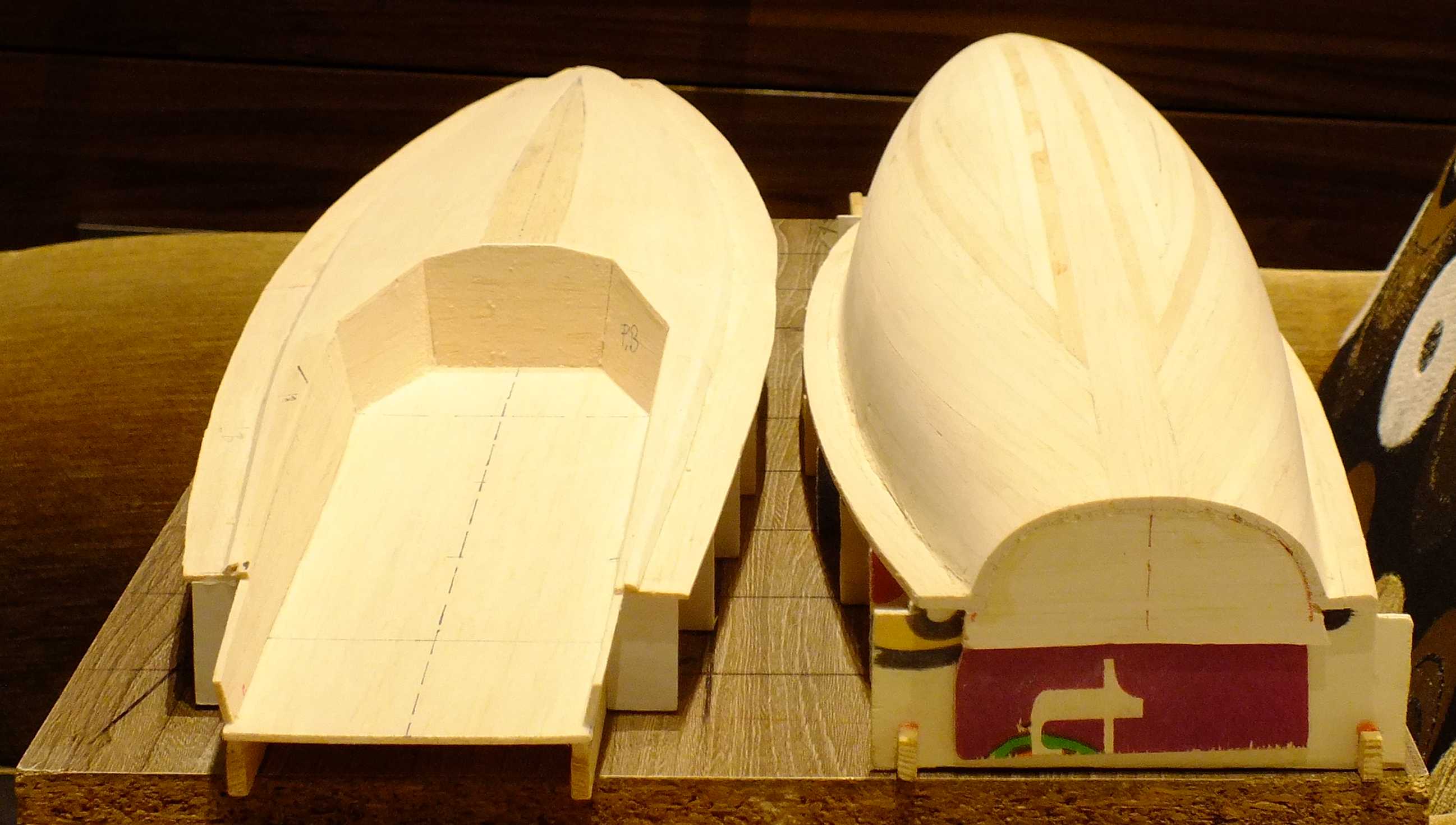 Pierwszy etap budowy kopyt już zakończyłem. Kopyto kadłuba zostanie pokryte cienkim laminatem szklanym (tkanina Aeroglass ~50 g/m^2) i dopiero po tej operacji zostanie wykończone do postaci gotowej do formowania. Po cichu liczę na dodatkowy ładny kadłubek drewniany. Pokład będzie tylko szpachlowany i malowany. Tył pokładu będzie dopasowywany już do formy kadłuba, mniej więcej od miejsca gdzie się kończy kołnierz.