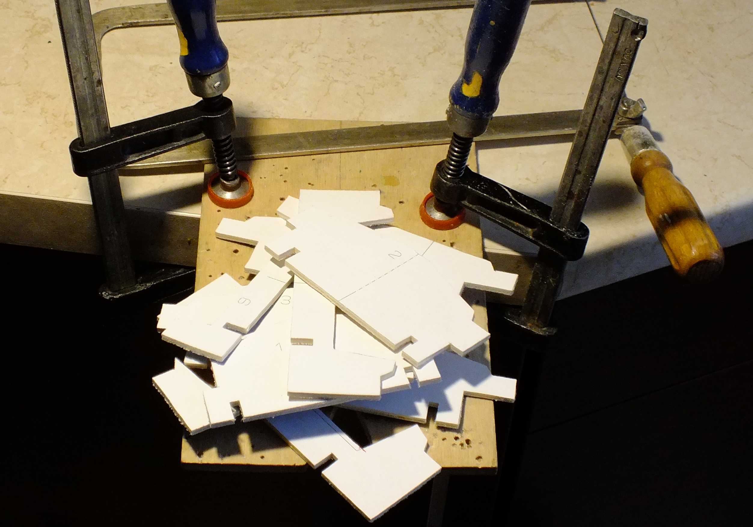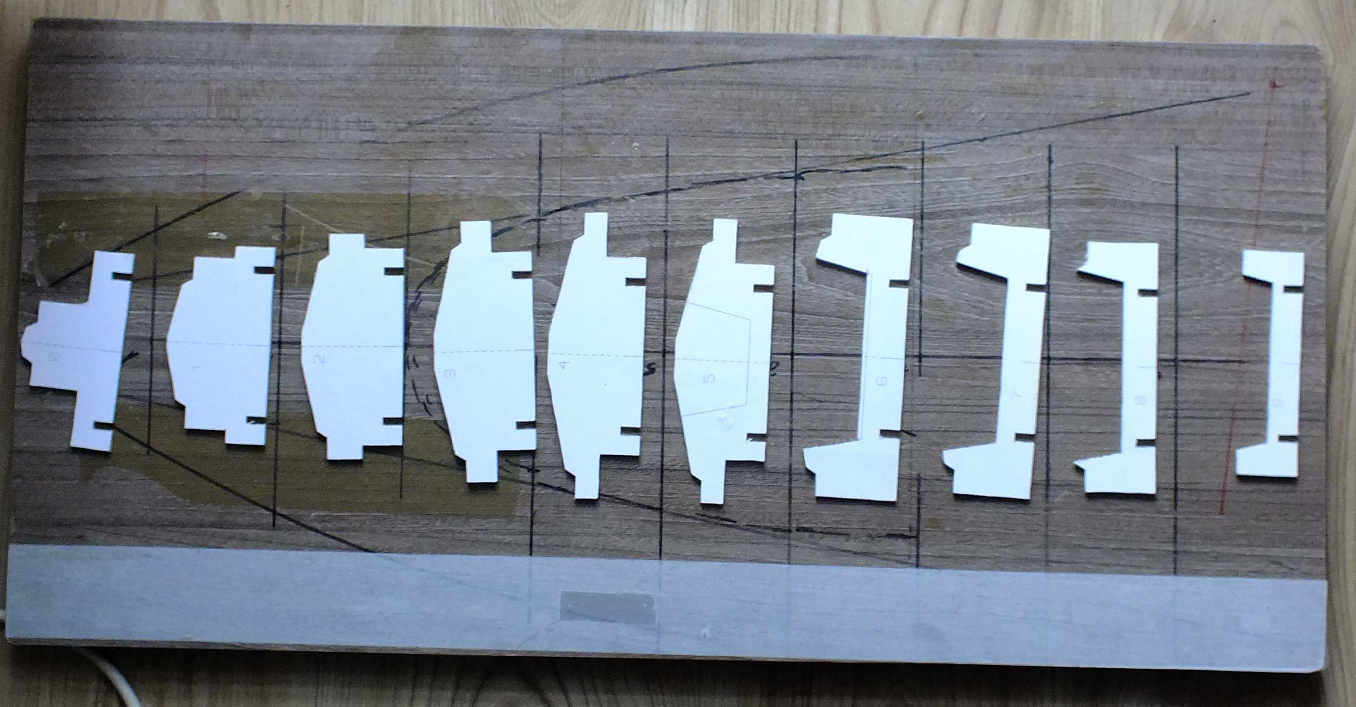 Dziś wyciąłem szablony i może skleję heling do budowy formy pokładu. Na zdjęciach maszyna do wycinania i szablony pokładu ustawione już we właściwej kolejności.