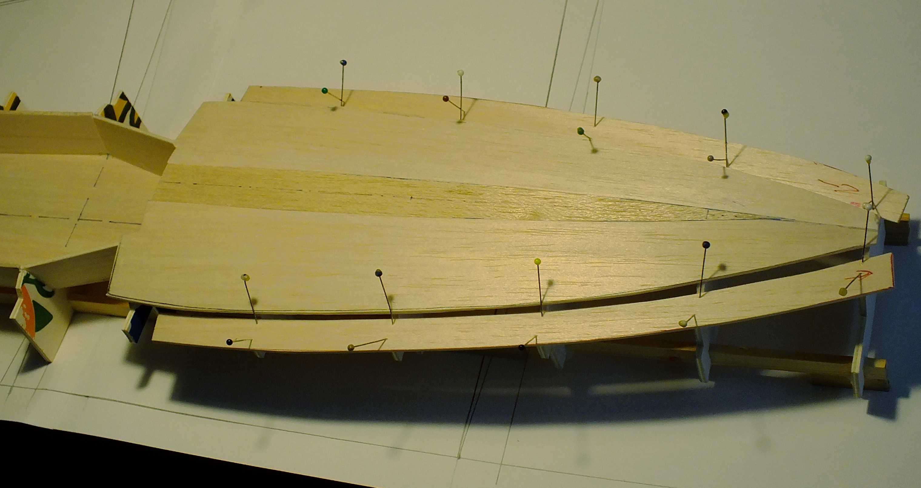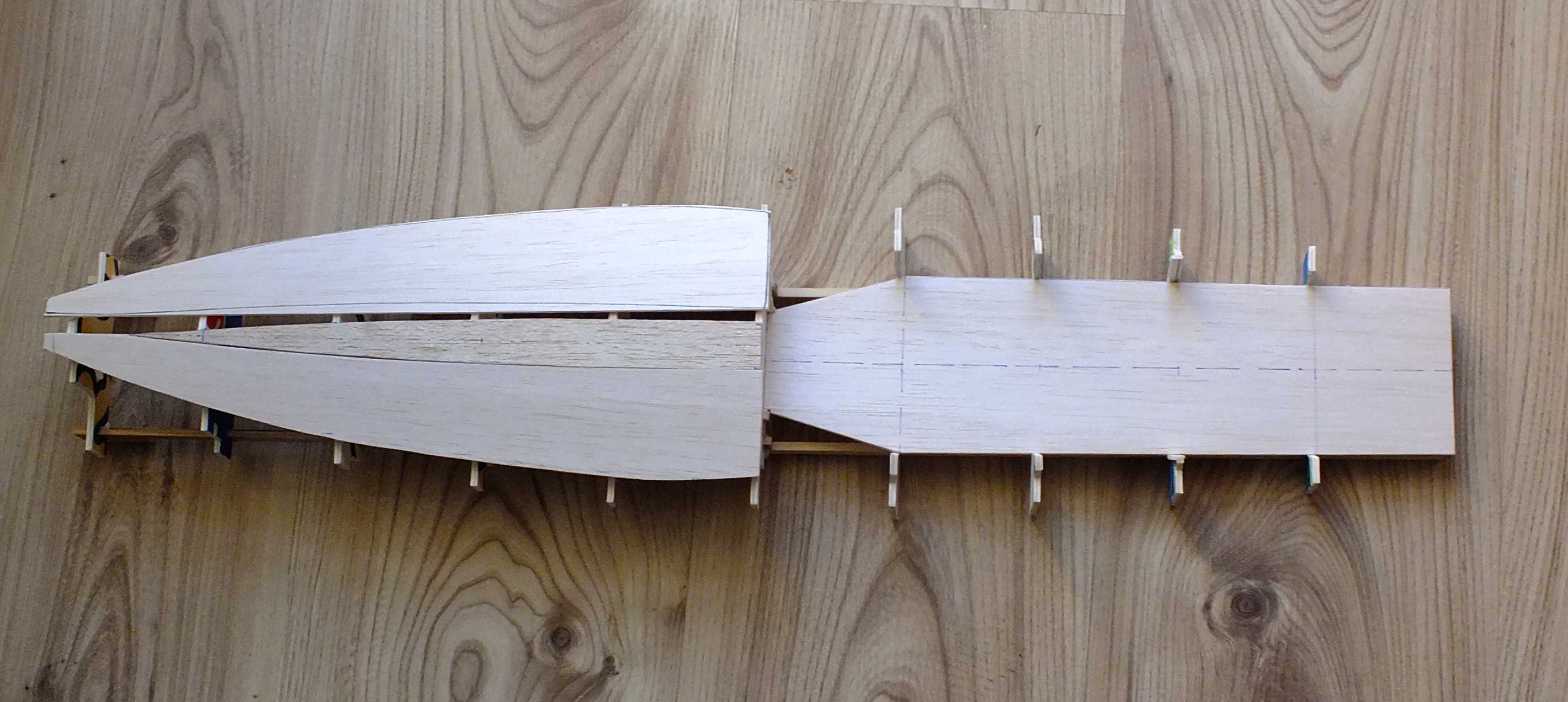 Prezentowane powyżej szablony skleiłem w heling makiety pokładu. Poszycie kopyta to balsa 2.0 mm. Proste rozwijalne powierzchnie nie komplikują życia. Na zdjęciach etapy pracy. Kokpit jest głęboki, to obniża (minimalnie) środek masy kadłuba jednocześnie niestety zwiększając również (minimalnie) jego masę. Kopyto pokładu posłuży również do wykonania trzeciej formy na kołnierz wokół dolnej części kadłuba. Ta ostatnia forma w czasie laminowania skorupy będzie skręcona z główną formą, po utwardzeniu się laminatu będzie można ją odkręcić i wyjąć gotowy kadłub już ze zintegrowanym kołnierzem. Bez tego nie byłoby szans na tę operację.