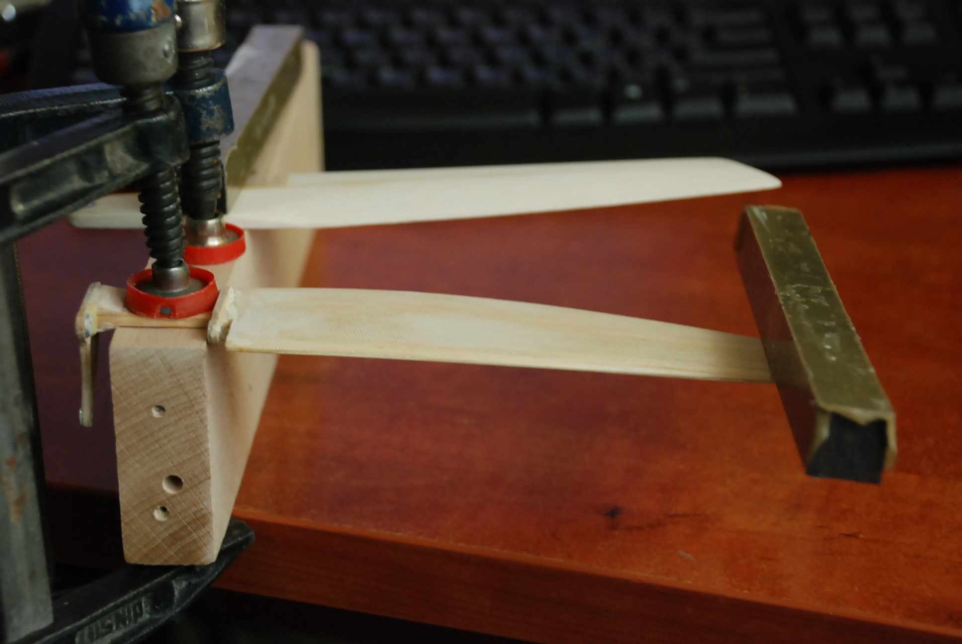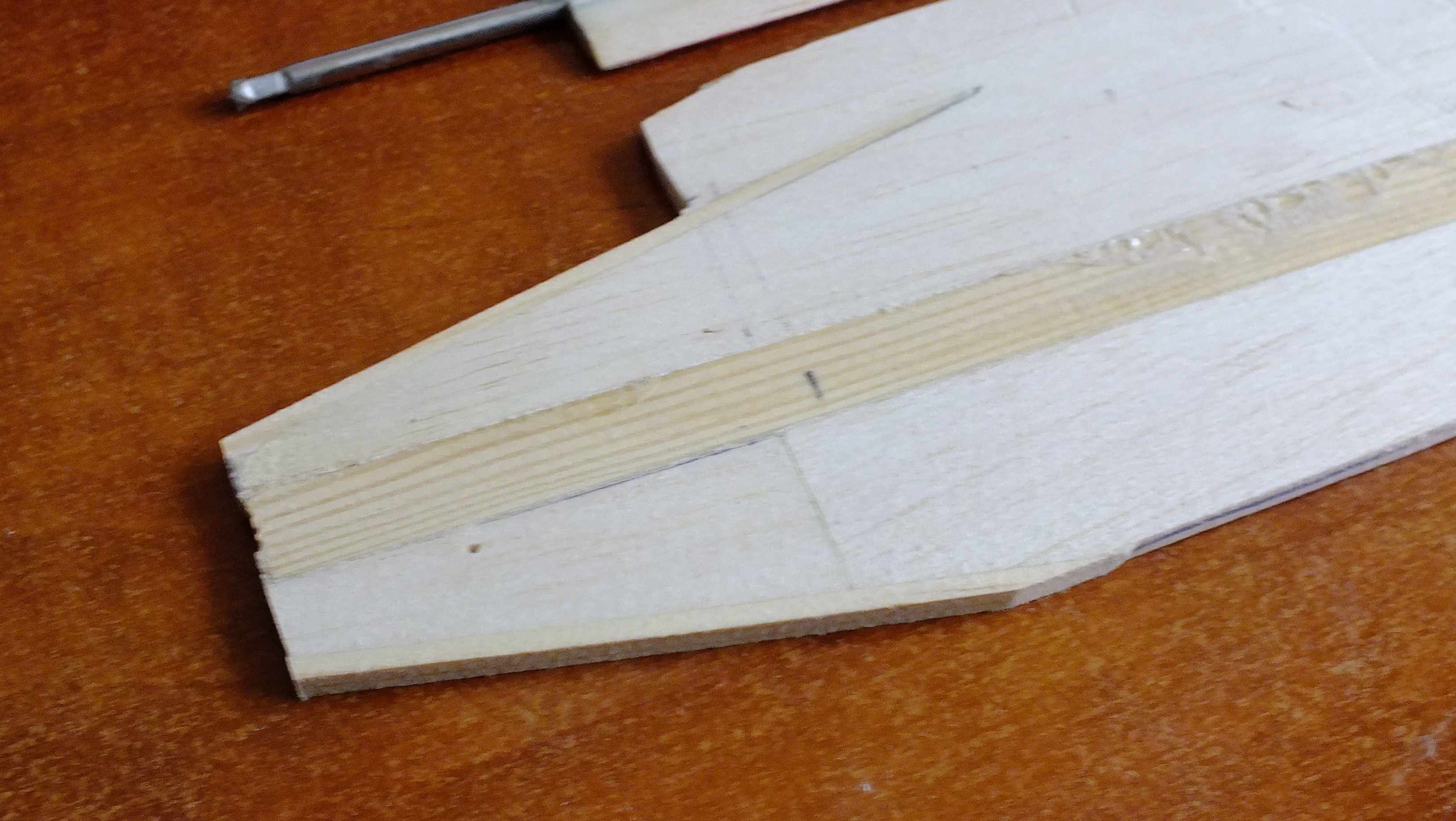 W sporej części modeli tej klasy płetwa "balastowa" jest wykonana z płaskownika duralowego. Ja zdecydowałem się na troszeczkę inna konstrukcję: rdzeń balsowy, dźwigar sosnowy 4*10 i płaszcz laminatowy na rdzeniu. Kanapka. Płetwa jest dzięki temu bardzo lekka. Testowałem płetwę sterowa o bardzo podobnej konstrukcji, efekty na zdjęciu. Nóż tokarski obciążający końcówkę płetwy ma masę 1/3 kg. Płetwa nie ma dźwigarka sosnowego. Płetwa w stanie takim jak na zdjęciu ma masę aż: 4g.