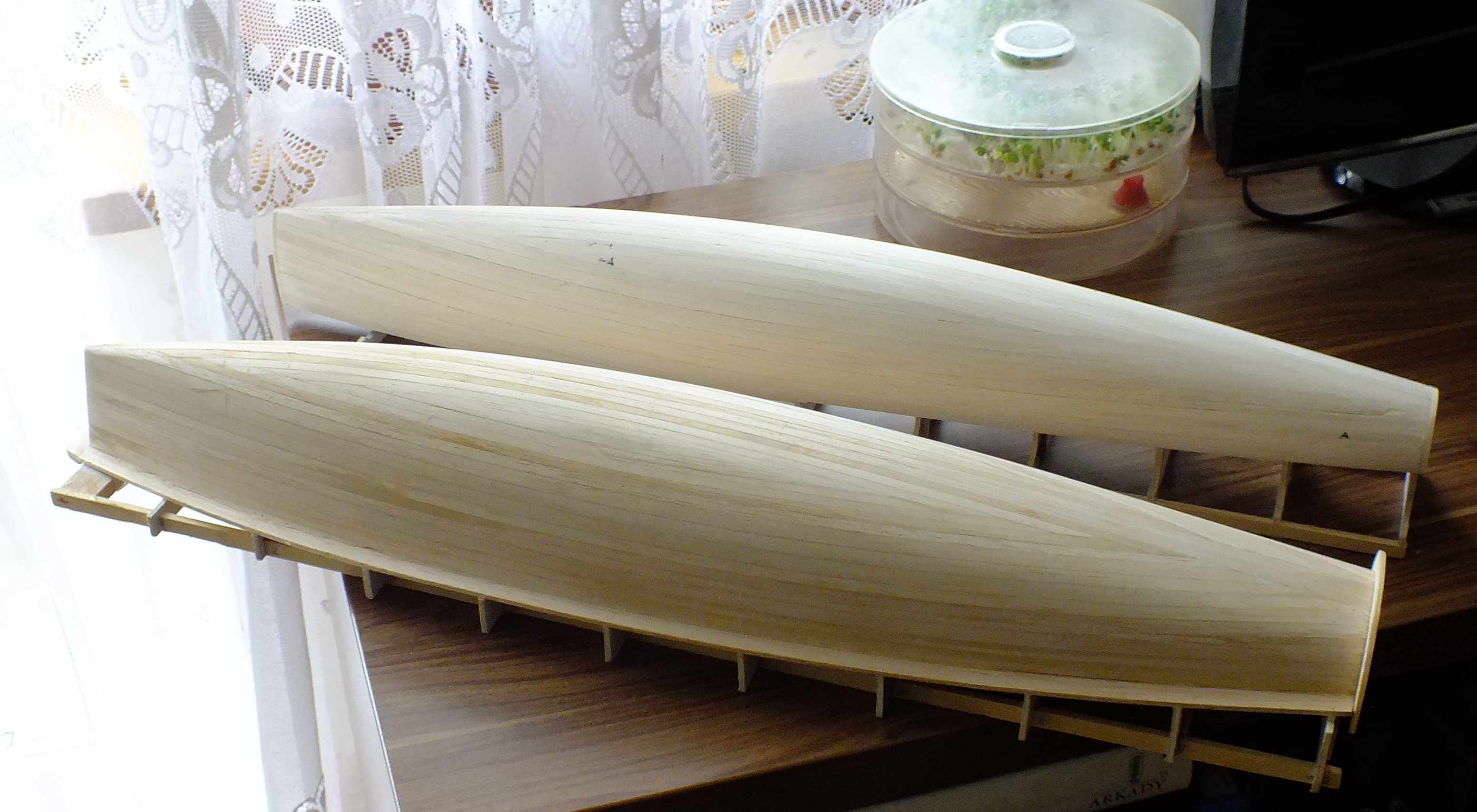 Na poczatku marca powstały linie jeszcze jednego jachciku tej klasy. "Ładność" linii i parametry kadłuba sprawiły, że postanowiłem budować równolegle dwa modele tej klasy. Mając trochę zapasów balsy 3.0 zrobiłem szablony, skleiłem w heling i zacząłem modelować "łódź podwodną". Kadłub jest niski i wąski i z racji przekrojów zbliżonych do okrągłych trochę ją przypomina. Nie zakładałem wykorzystania kopyta jako przyszłego kadłuba, pozwoliło to na zmianę kleju użytego do klejenia klepek. Zwykły Patex do drewna (biały). Na etykiecie jest co prawda napisane "wodoodporny", ale klasa wodoodporności raczej nie za bardzo szkutnicza. Ten drugi model będę oznaczał jako NSS.
