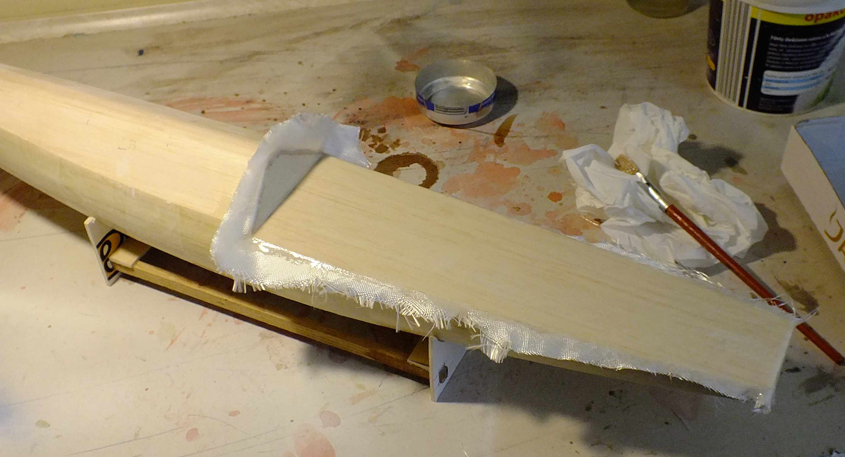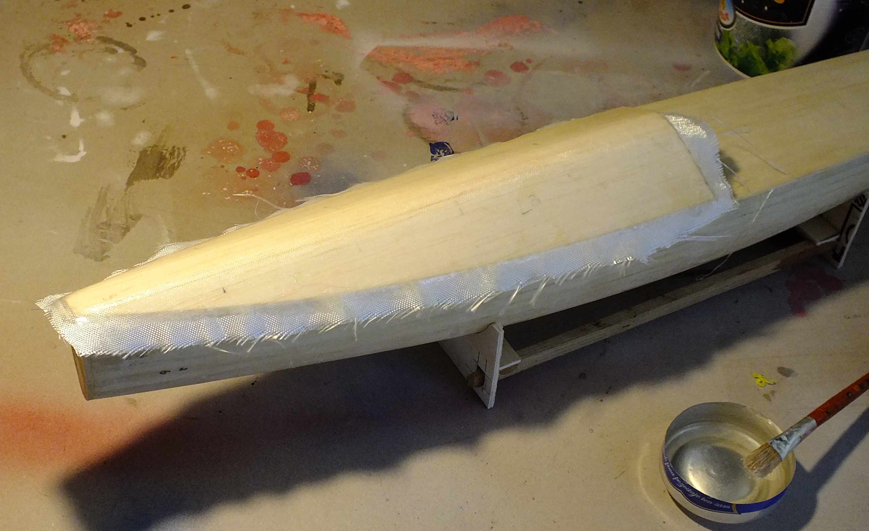 Dobra pogoda w piątek (temperatura i dzięki temu możliwość wietrzenia mieszkania), pozwoliła na ruszenie z laminatami. Kopyto kadłuba zostało polaminowane tkaniną 80 g/m^2 z wykorzystaniem Epidianu 53. Teraz najmniej przyjemna część przygotowywania kopyta do formowania, szpachlowanie i szlifowanie itd.