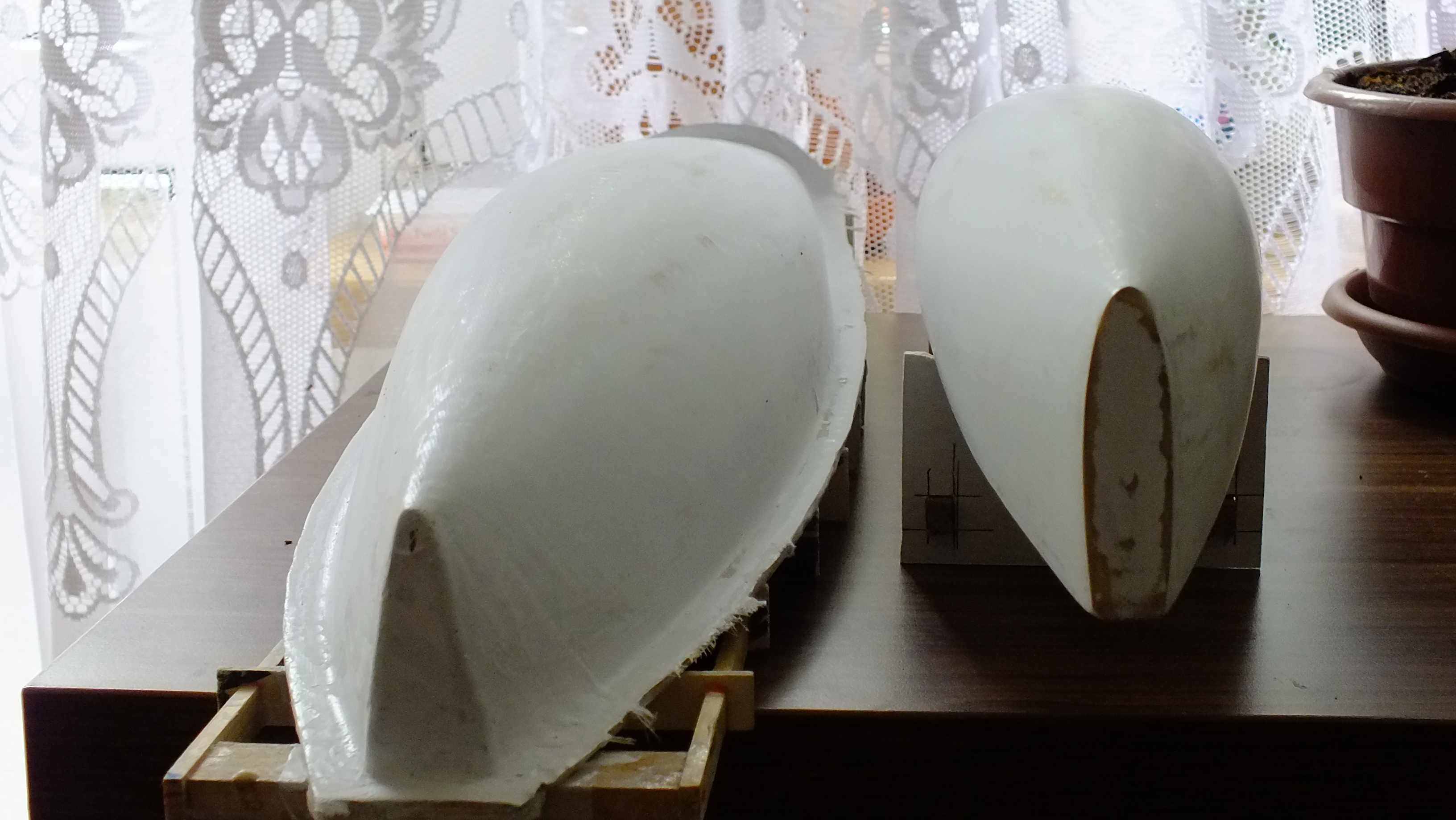 A w RG oba kadłuby powolutku przygotowuję do formowania. #01 otrzymał pierwszą warstwę podkładu, #2 drugą. Jako podkład używam lakieru poliuretanowego (OLIWA) ze sporym dodatkiem talku. Po szlifowaniu wygląda to następująco.