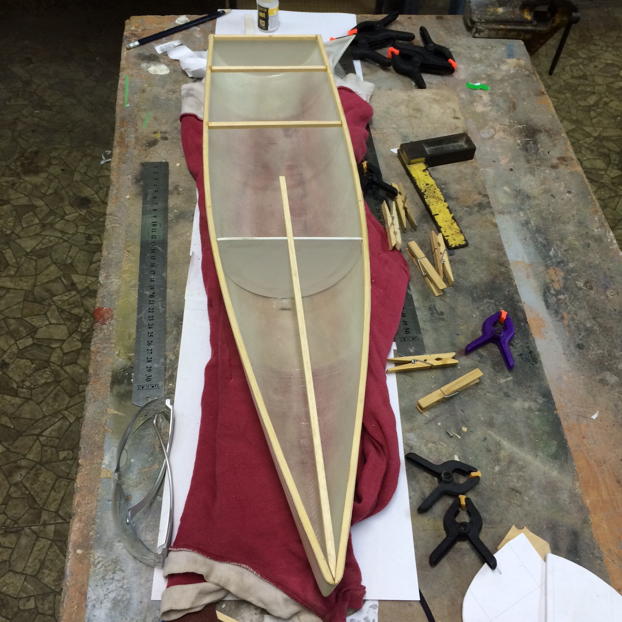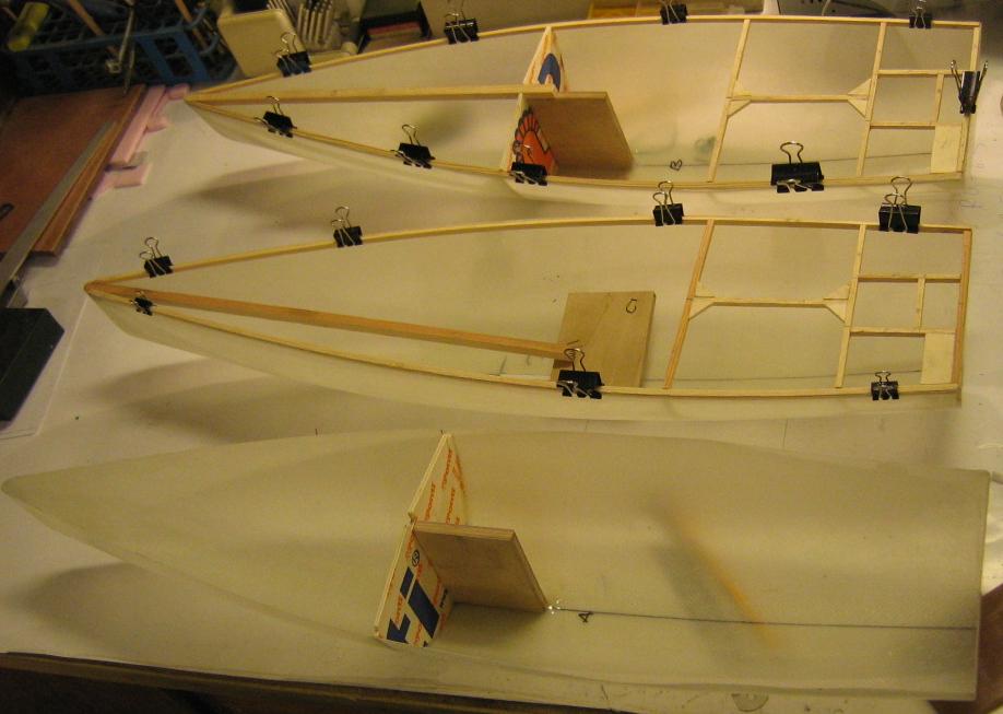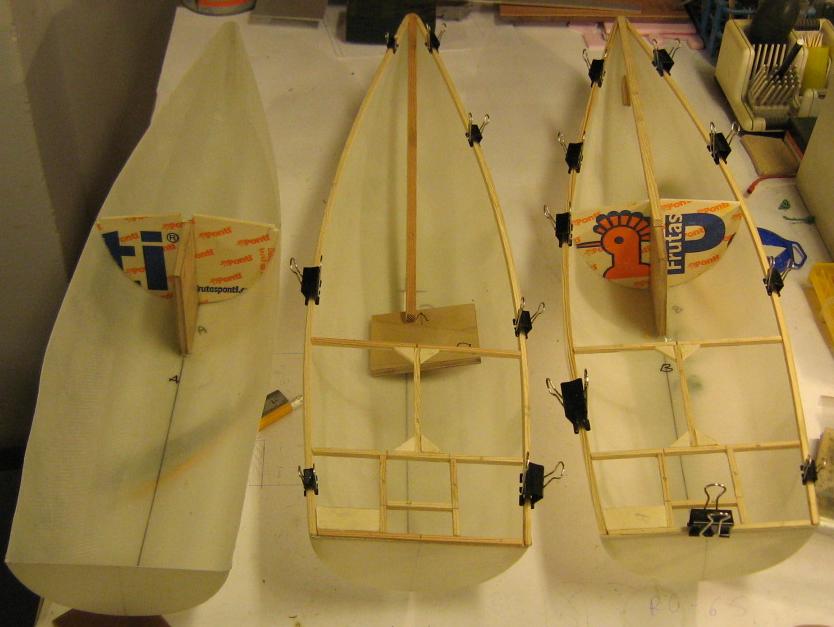 Kadłub został odchudzony o dwie wręgi. Wręga główna wraz z listwami wklejona została na CA. W przyszłości całość będzie wzmocniona żywicą.