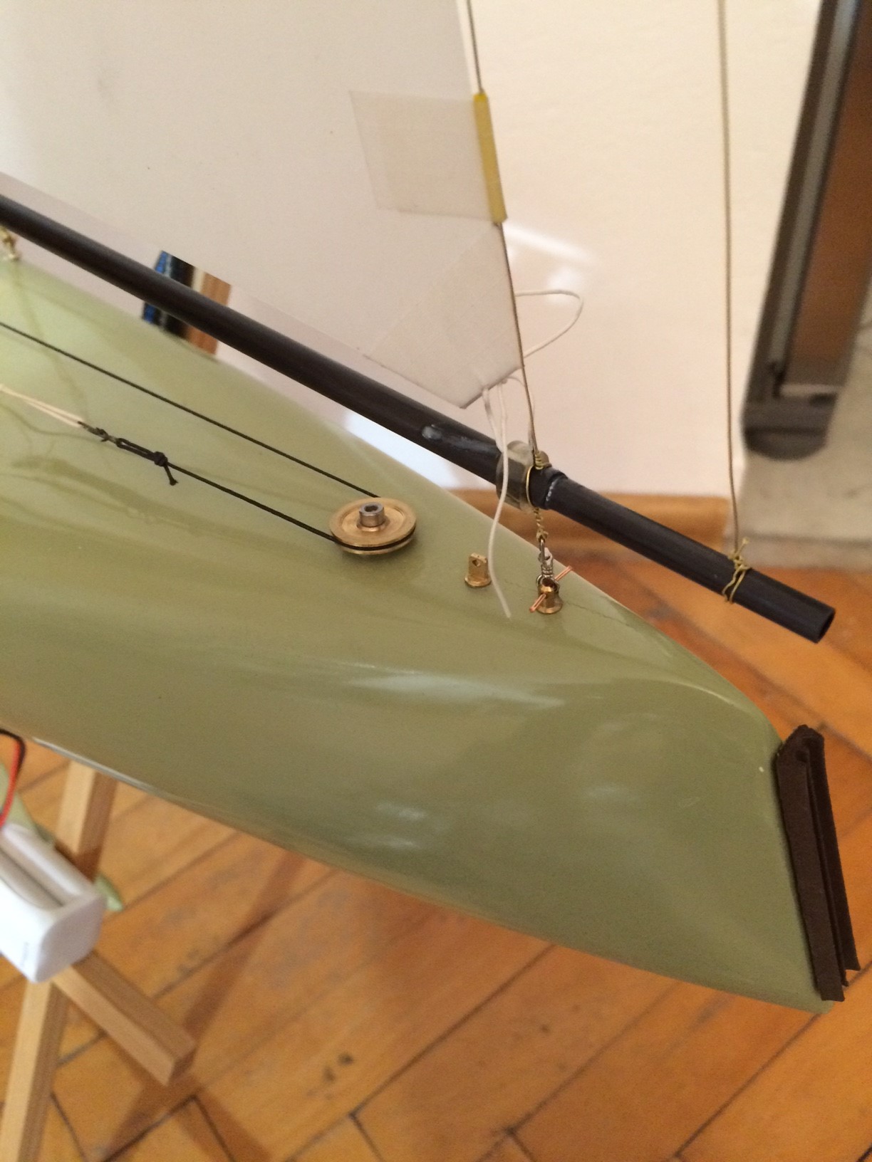Łódka po szybkim remoncie gotowa do zawodów. Kolega pomógł mi zreanimować kadłub (zalane żywicą miejsce przegrzania od wewnątrz, przeszlifowana i pomalowana część zewnętrzna burty). Ja poskładałem wszystko do kupy, dodałem kilka linek i wymieniłem sztag i achtersztag. Przedłużony został też bom foka. Niestety pogoda nie sprzyja testom, więc wszystko wyjdzie w praniu w sobotę