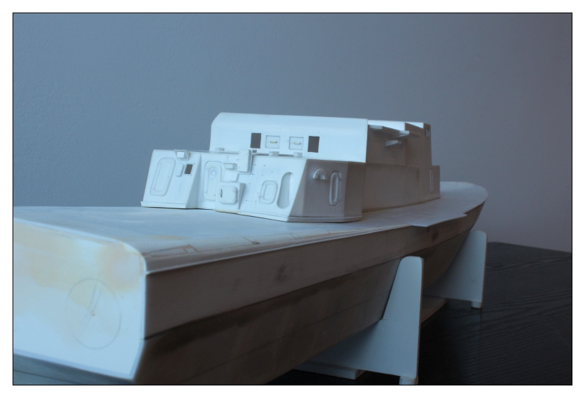 Stan na dzień dzisiejszy jak na foto,kadłub przykryty pokładem -szczelny, nadbudówka plus kilka detali.