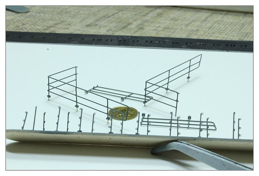 Witam. Zabrałem się za relingi,jako pierwszy zrobiłem ten z pokładu rufowego,część jest lutowana,pręt mosiądz 0,5mm ,a pozostały to składane słupki z przelotkami na linę-tak jest na oryginale ,