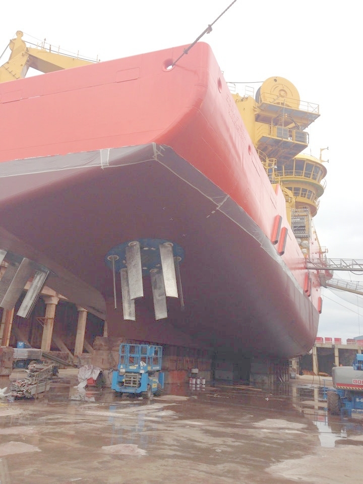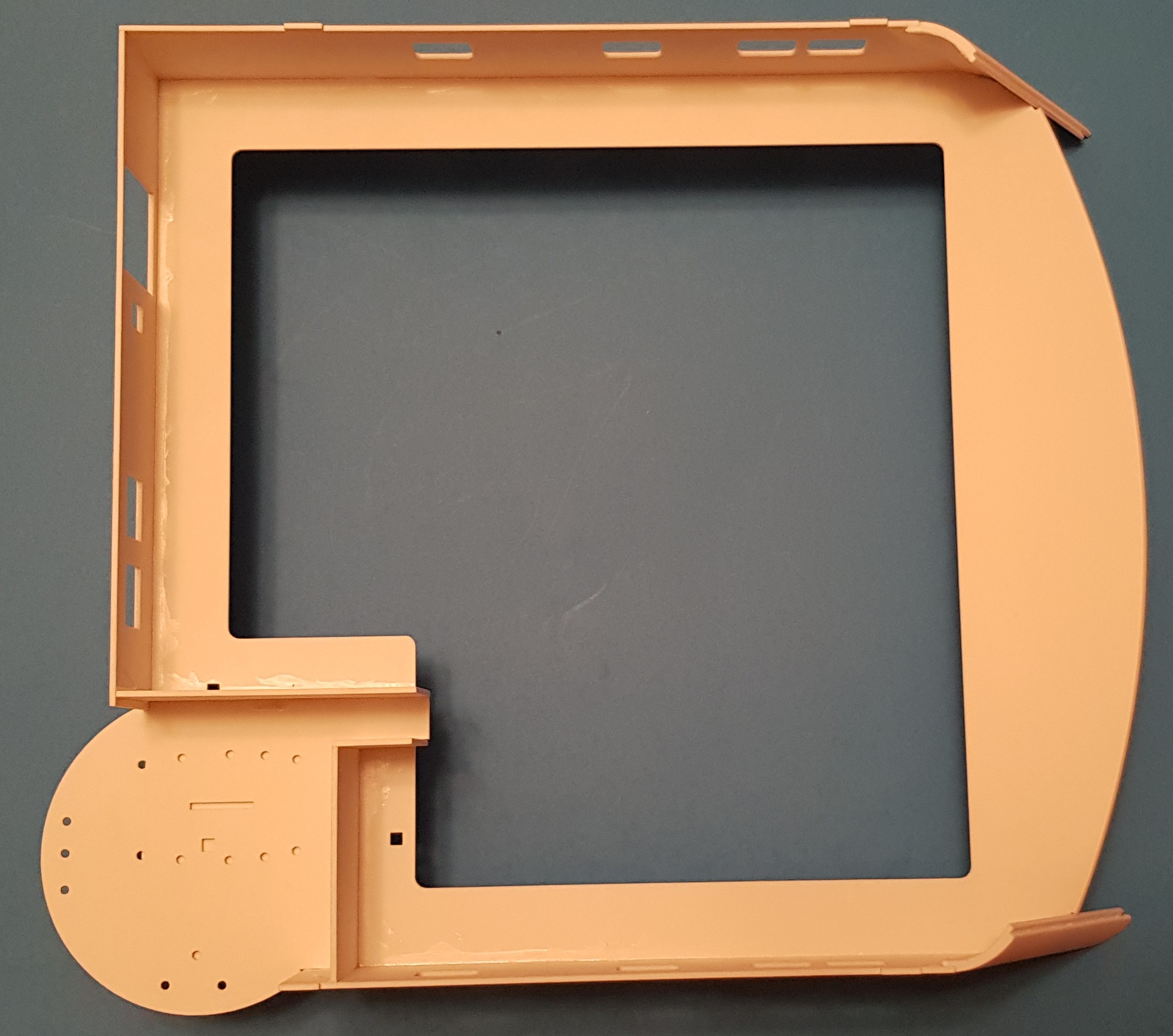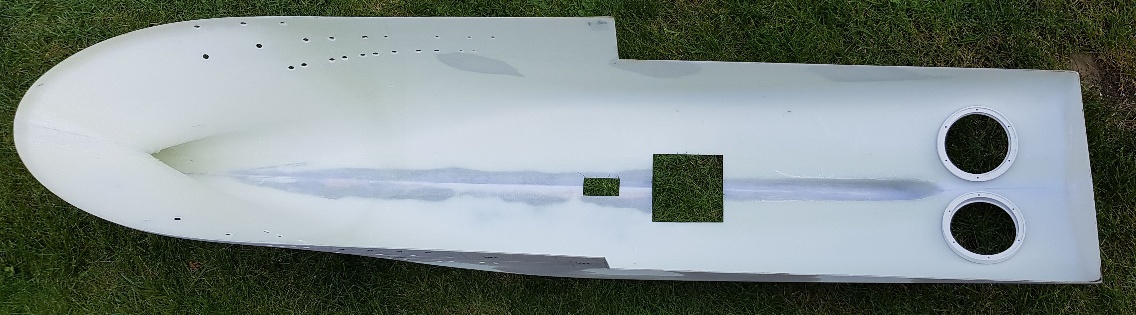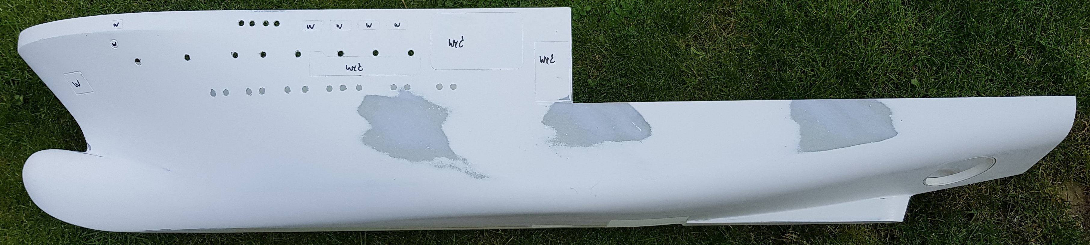 Jako że pogoda sprzyja pracom pylącym szlif kadłuba i elementów nadbudówki się odbył. Nawiercone bulaje i wycięte otwory w dnia pod studnie sonaru oraz moonpool. Wycięte i wklejone mocowania pędników (białe pierścienie). Wycięte ściany z oknami do sterówki.