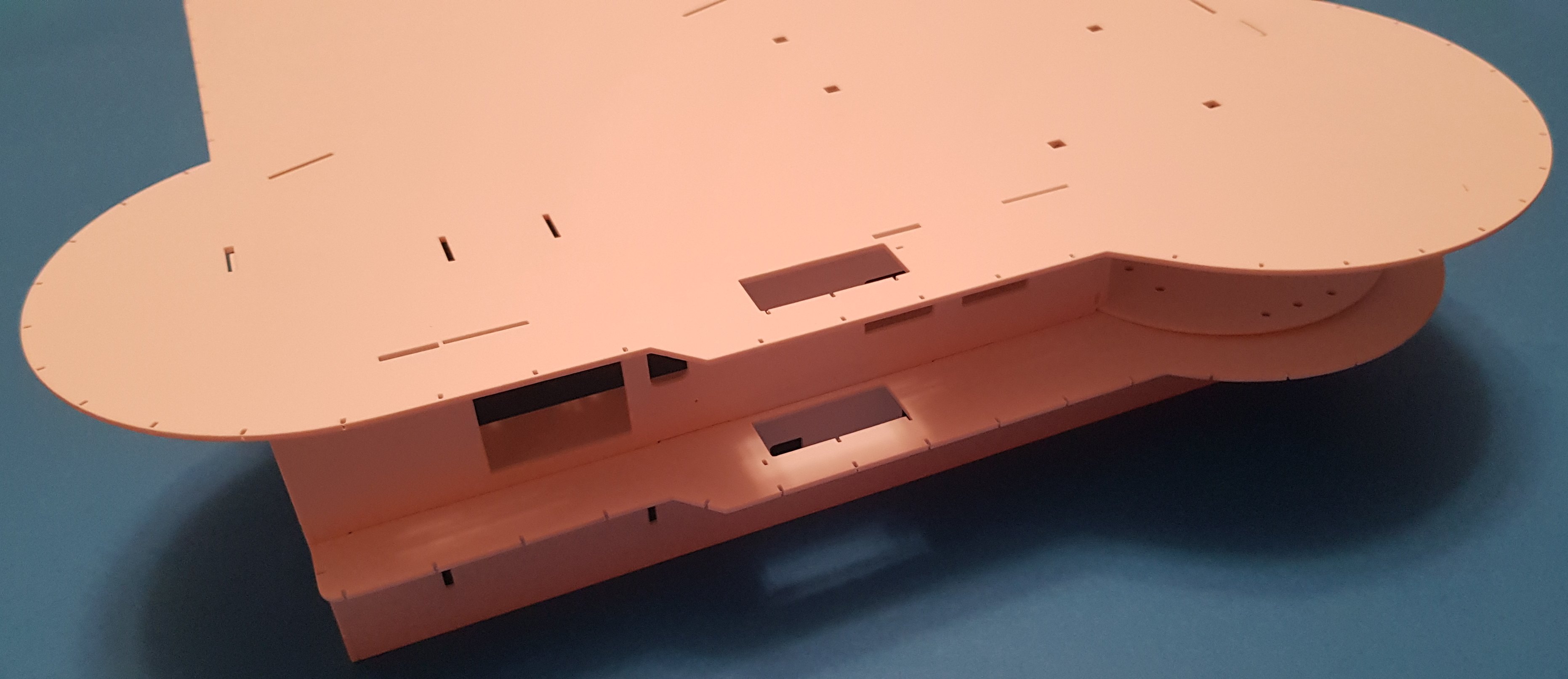 Dziękuje za kibicowanie. Doszły studnie moonpoolu i wysuwanego sonaru oraz dziura pod pionowy wysuwany ster strumieniowy i hangar pojazdu ROV. Podziałałem również przy dolnym poziomie nadbudówki.