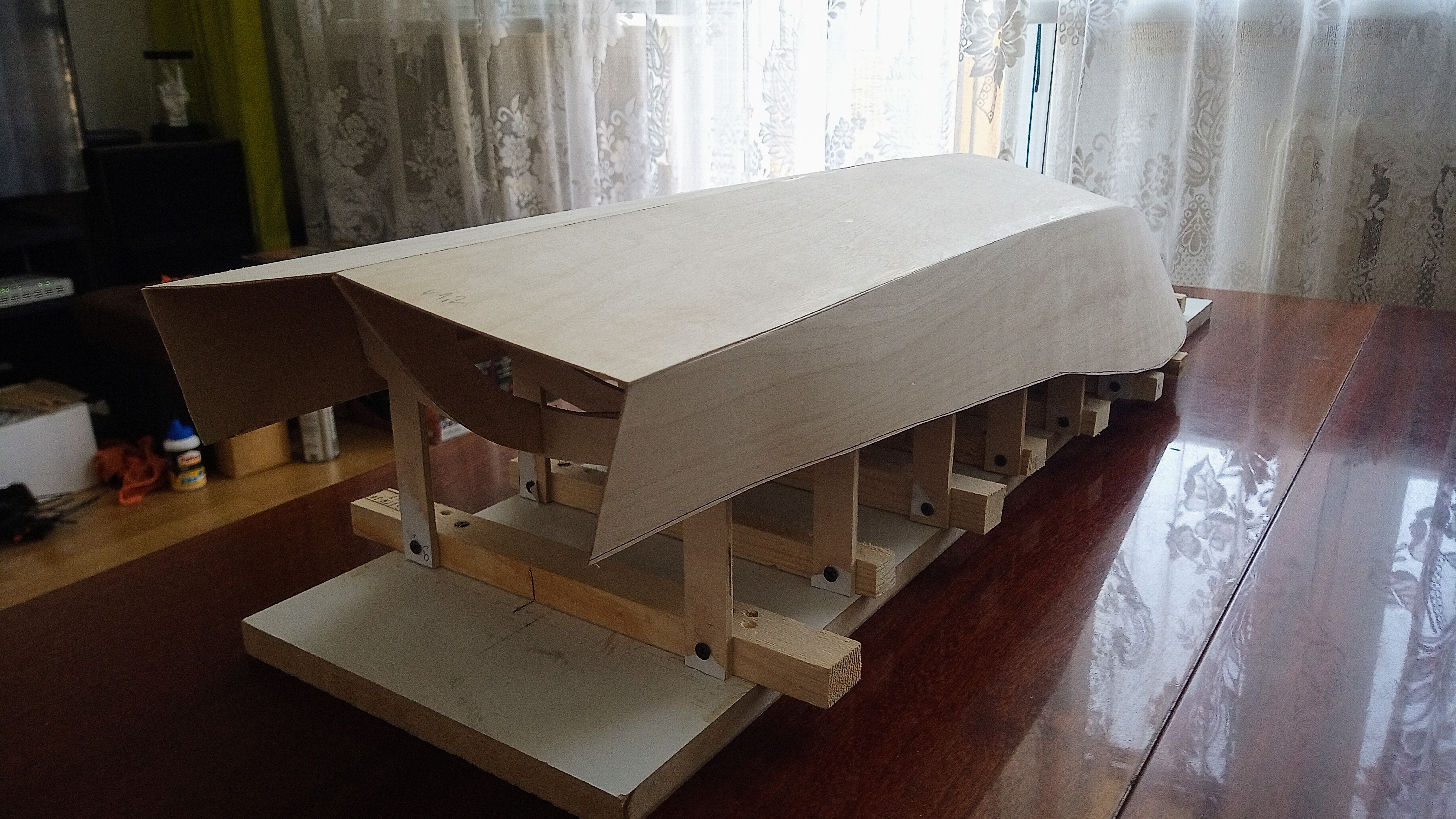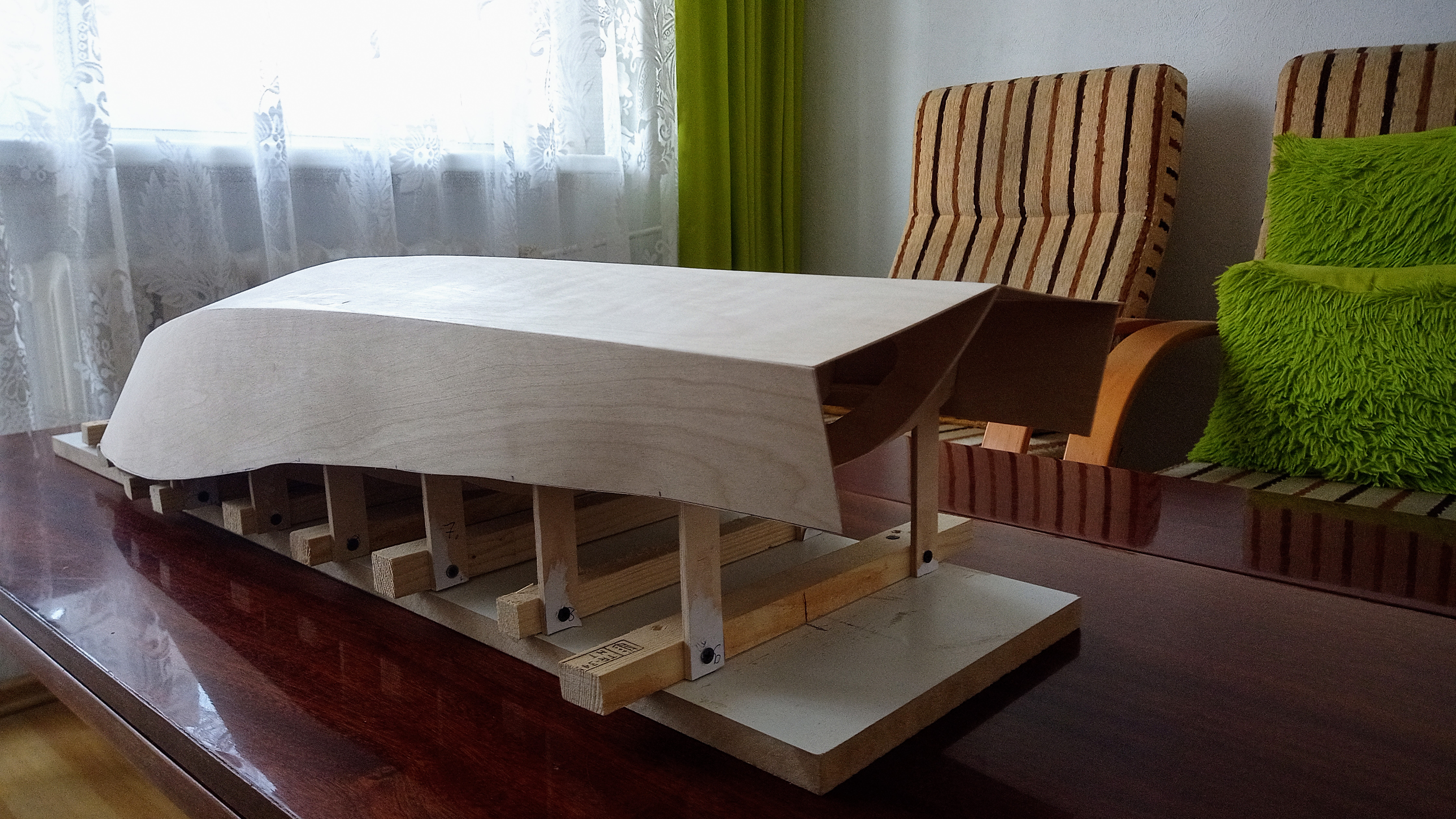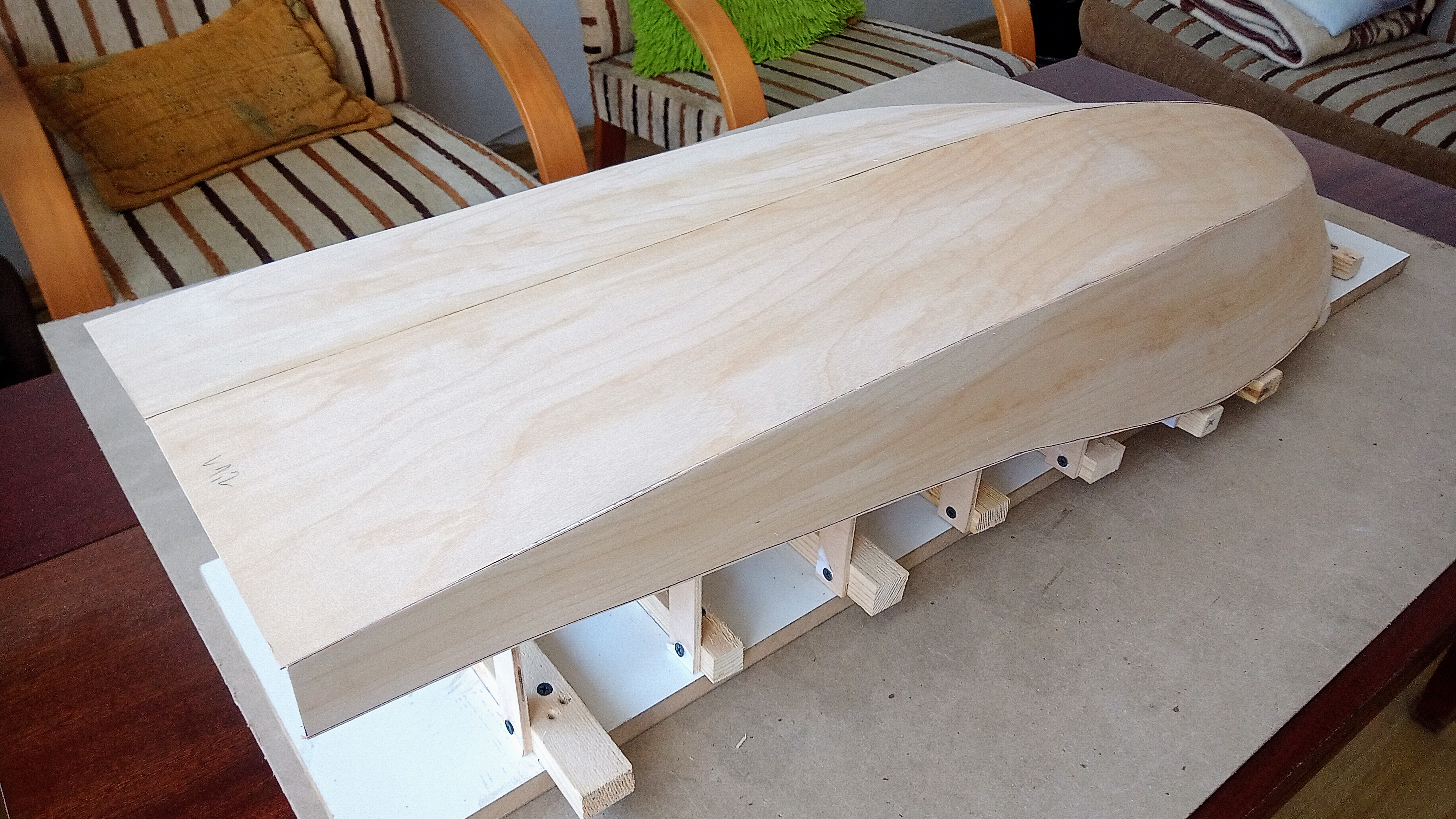 Kadłub został zdjęty z deski, i bardzo powoli (mało czasu ostatnio) zaczynam szlifowanie / obcinanie nadmiaru sklejki.