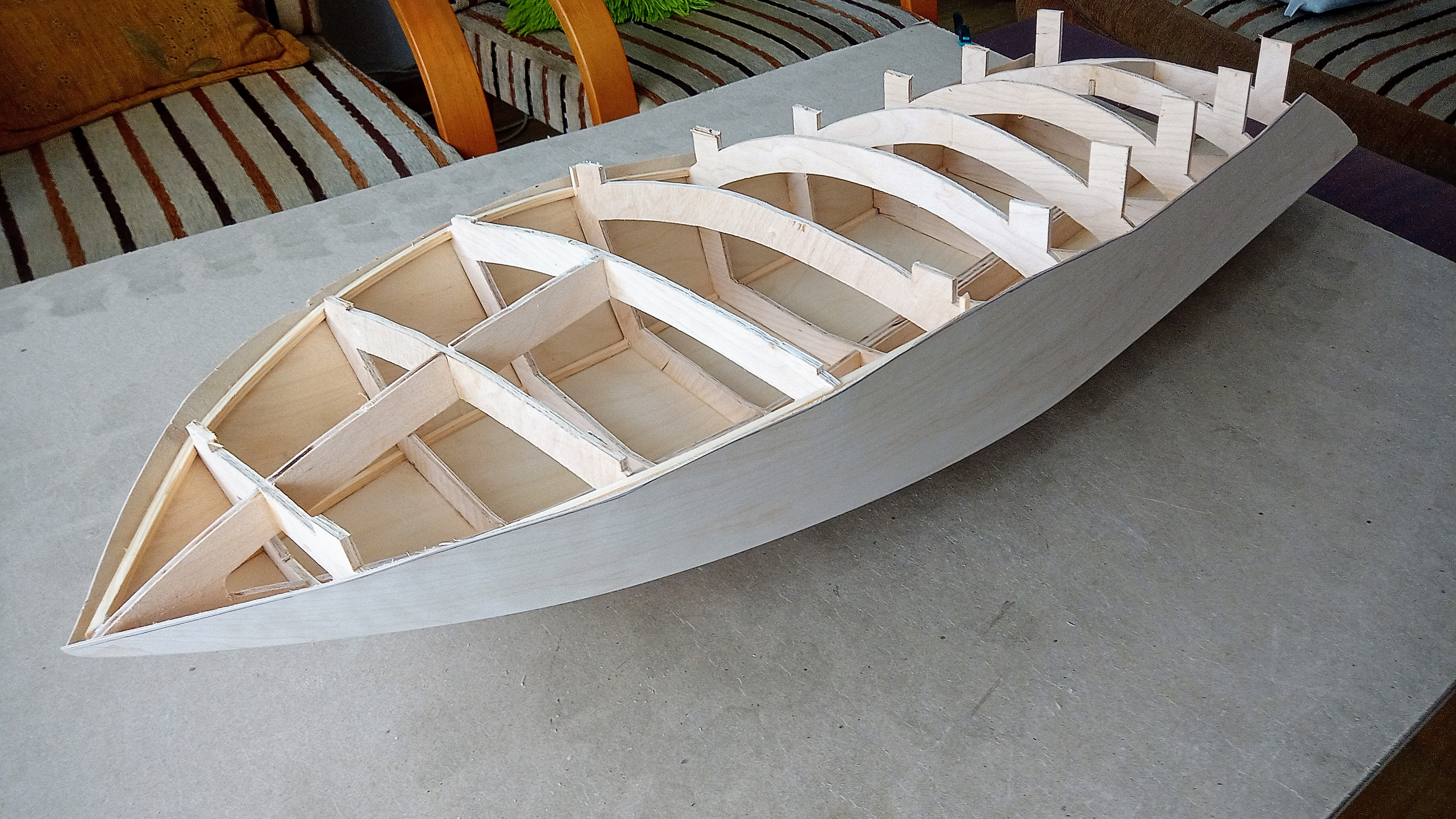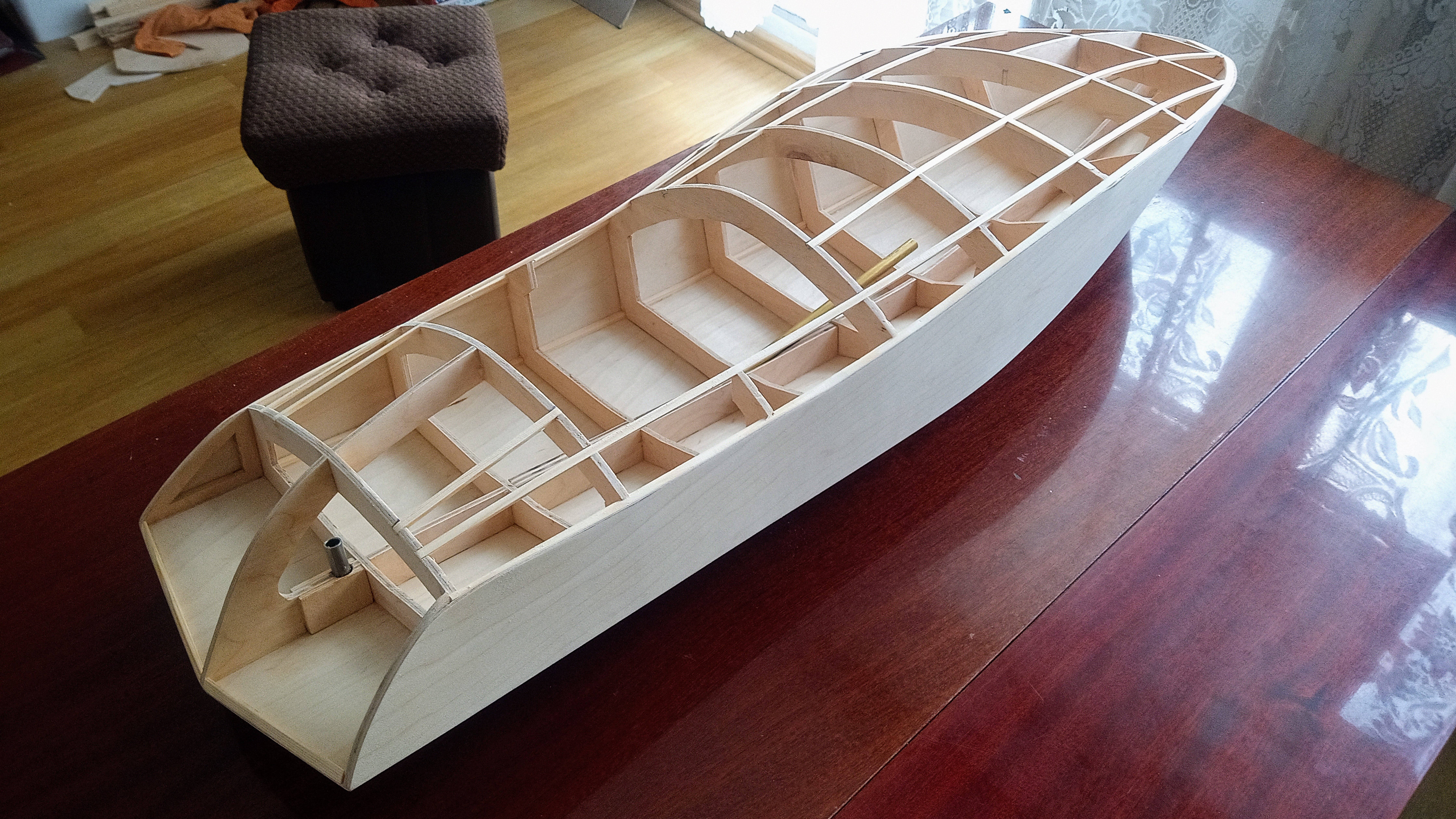 Kadłub został zdjęty z deski, i bardzo powoli (mało czasu ostatnio) zaczynam szlifowanie / obcinanie nadmiaru sklejki.
