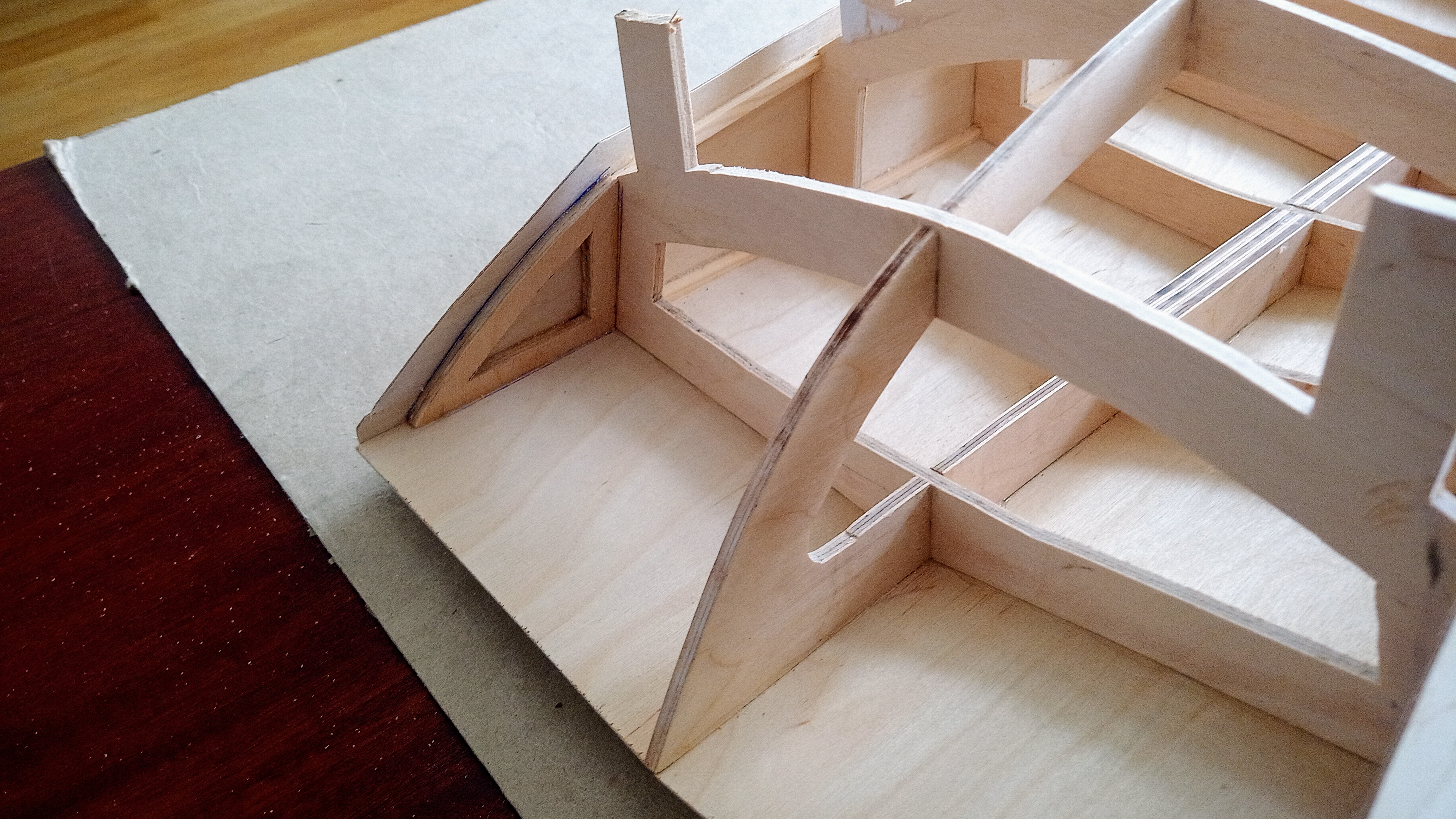 Wyciąłem górną część wręgi w miejscu gdzie powstanie przedział pasażerski, wkleiłem kilka listewek które wzmocnią przyszły pokład, wkleiłem też dławicę steru.