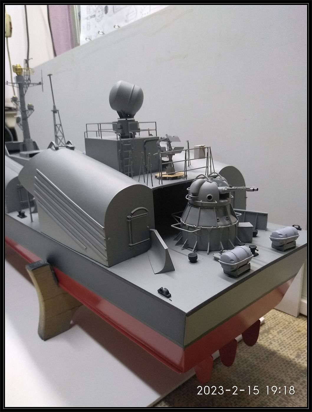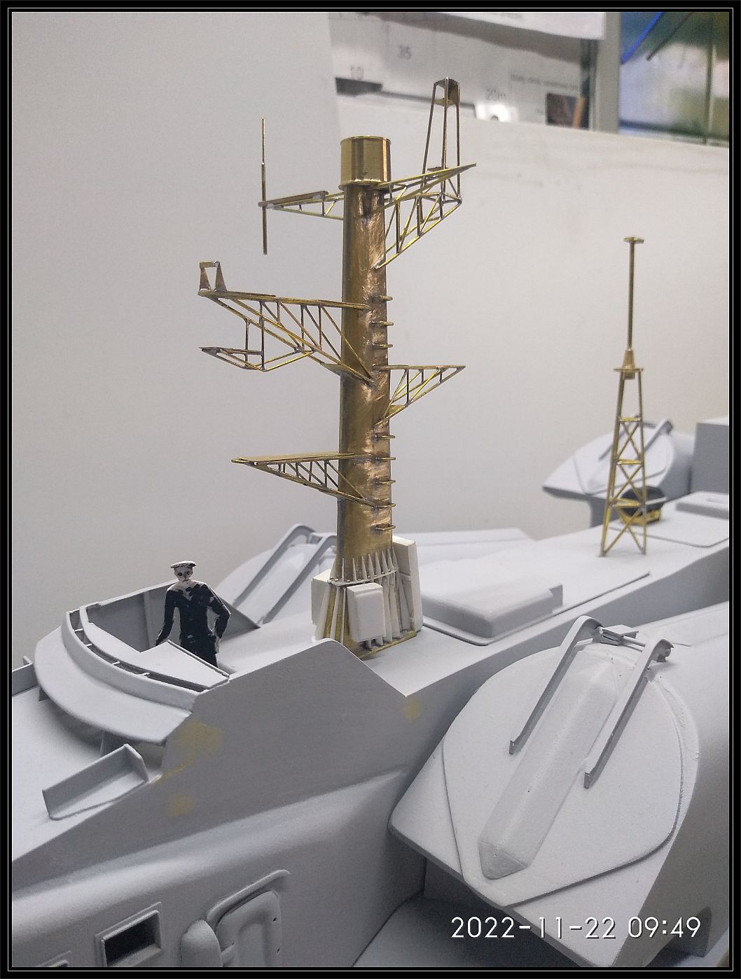 Dorobiłem platformę pod wyrzutnie przeciwlotniczych kierowanych pocisków rakietowych Strzała 2M, oparta na hangarach w części rufowej okrętu. Dorobiłem relingi, materiał to mosiądz pręt 0,7 a oczka 0,2.