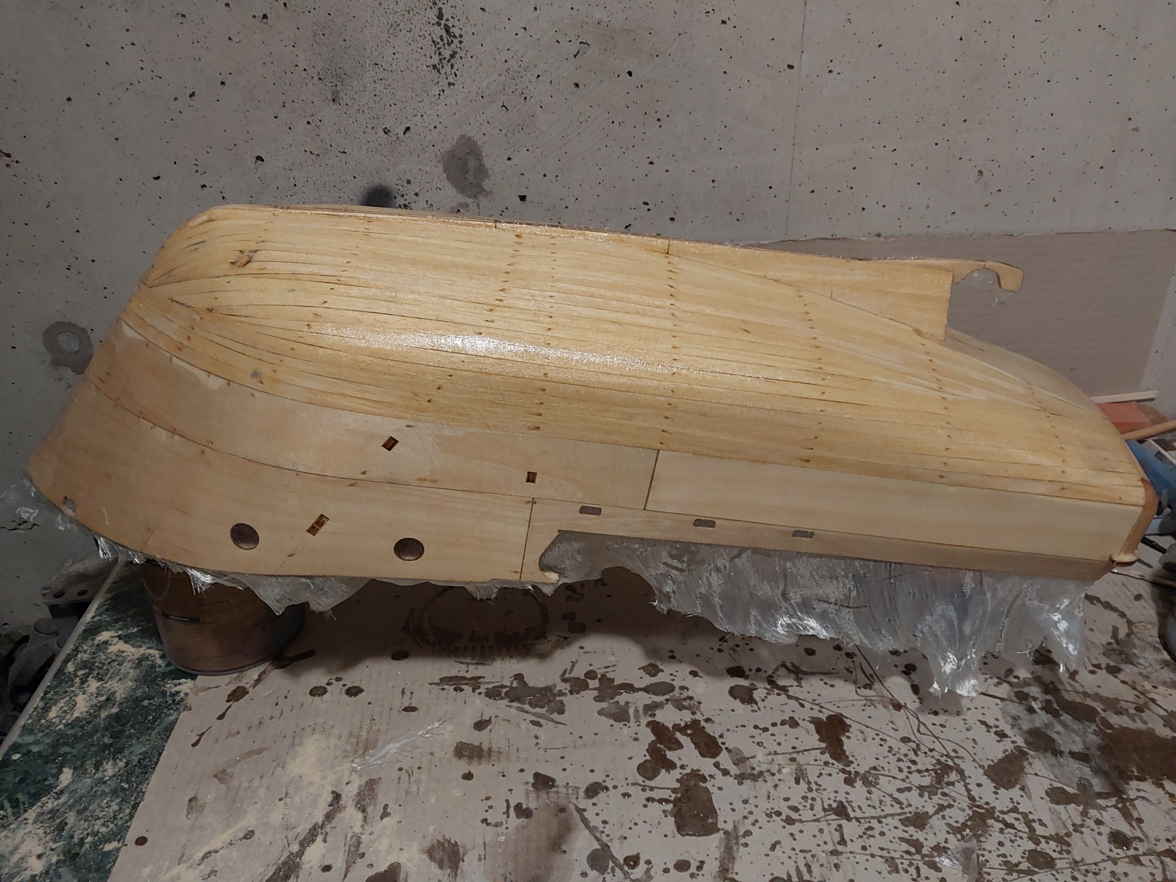 Skończyłem właśnie poszycie kadłuba. Teraz następny etap prac to zaimpregnowanie wnętrza lakierem jachtowym. Wyszlifowanie poszycia i pokładów (pokłady zaimpregnowane są żywicą epoksydową, oklejenie nadburcia. Po zakończeniu tych prac będę mógł przystąpić do laminowania kadłuba tkaniną szklaną.