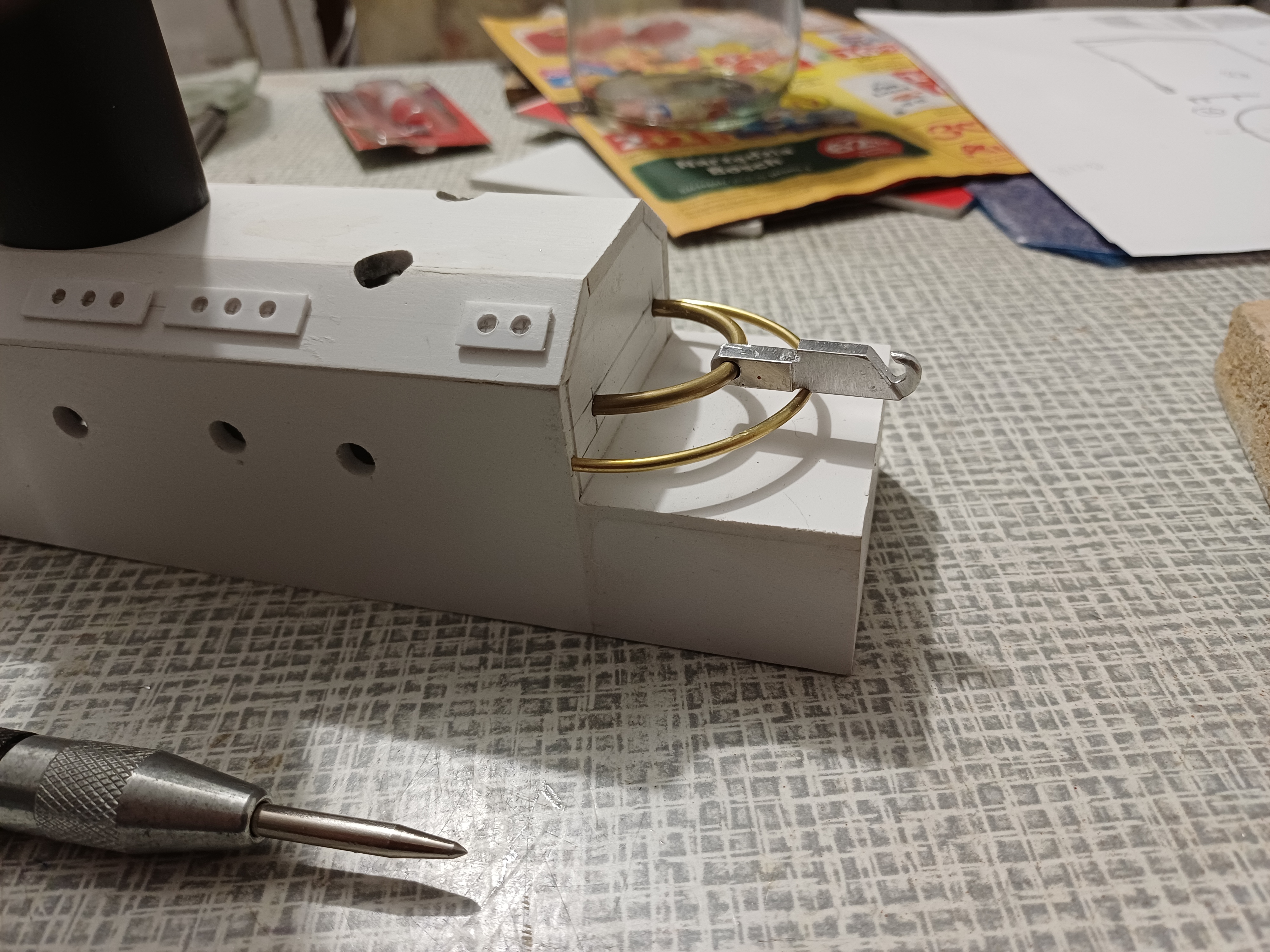 Nadbudówka składa się z 4 części. 1 i 2 wysoka, 3 niższa i 4 mała najniższa. Na niej ma być maszt i zdejmowanie nadbudówki z masztem utrudnione. Wykorzystałem rozwiązanie ze zdjęć na niemieckiej stronie i oddzieliłem tą część doklejając ściankę na zespół haka .
