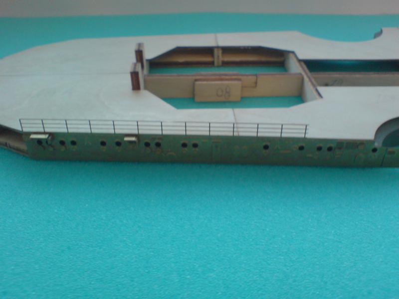 Ale w miedzyczasie jak wysychały kolejne warstwy szpachlówki na dziobie i rufie, pozwoliłem sobie na wykończenie nadbudówki przedniej, zdjecia zdązyłem zrobic jeszcze w naturalnym swietle wiec co nieco widac.