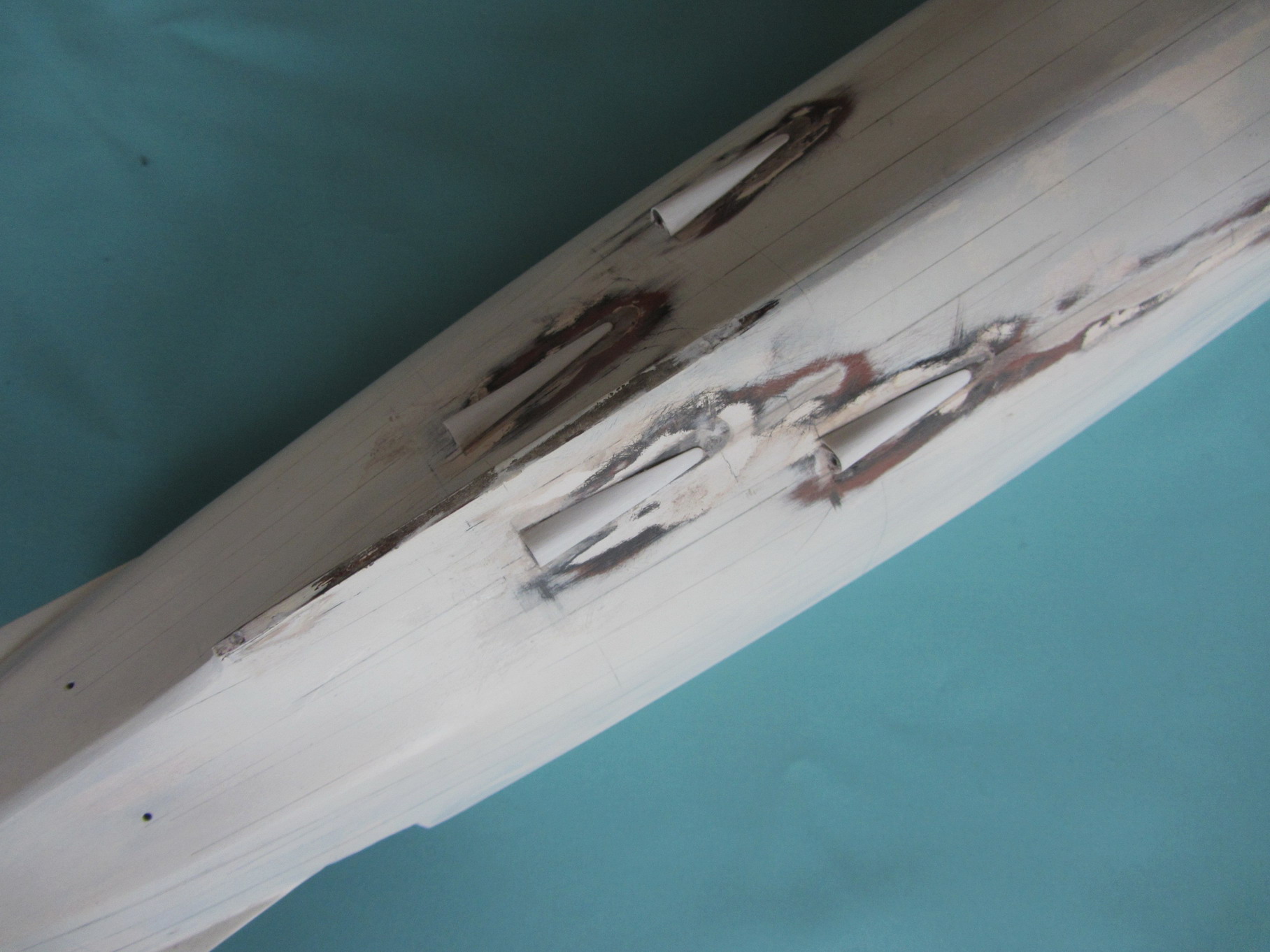 Powolutku do przodu. Na zdjęciach złożony układ napędowy ze sterami. Podpory wałów wykonam na samym końcu. Na dziobie jeszcze nie wycięte kluzy kotwiczne. No i nowy pokład lotniczy wycięty laserem przez kolegę forumowego gdasia. Wycięcie pokładu to praca na najwyższym poziomie, całkowicie spełniająca moje oczekiwania. Następny etap to już wyklejanie imitacji poszycia kadłuba i rozrysowanie pokładów i pomostów burtowych, które też będą wypalane.