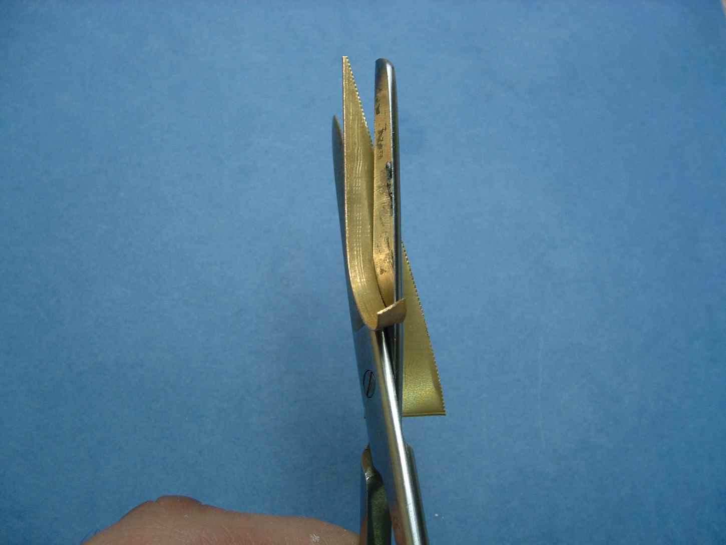 Odnośnie cięcia blaszek : do grubości 0,3mm używam nożyczek chirurgicznych takich jak na załączonym zdjęciu , powyżej 0,3mm do cięcia używam nożyc do blachy ja mam akurat firmy STANLEY choć mogą być inne nożyce te które mam mają jedną wadę gdyż zostawiają taka ząbkowaną fakturę w miejscu cięcia która trzeba spiłować , dłuższe paski blaszki np, 0,4mm tnę na gilotynie , oba sposoby maja mankament bo paski ucięte skręcają się w śmigło dlatego po cięciu kładę pasek na klocku granitowym i przeciągam Kika krotnie małym kątownikiem z obu stron celem wyprostowania.
