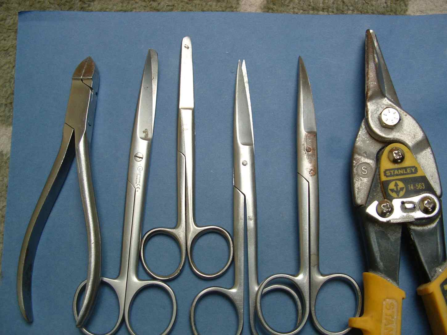 Odnośnie cięcia blaszek : do grubości 0,3mm używam nożyczek chirurgicznych takich jak na załączonym zdjęciu , powyżej 0,3mm do cięcia używam nożyc do blachy ja mam akurat firmy STANLEY choć mogą być inne nożyce te które mam mają jedną wadę gdyż zostawiają taka ząbkowaną fakturę w miejscu cięcia która trzeba spiłować , dłuższe paski blaszki np, 0,4mm tnę na gilotynie , oba sposoby maja mankament bo paski ucięte skręcają się w śmigło dlatego po cięciu kładę pasek na klocku granitowym i przeciągam Kika krotnie małym kątownikiem z obu stron celem wyprostowania.