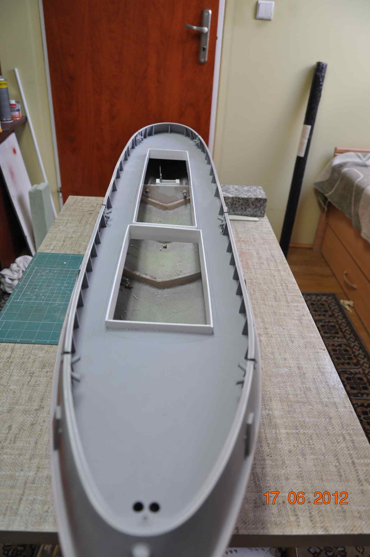 Długo się zastanawiałem czy zrobić płetwy po bokach kadłuba , co prawda na planach ich nie ma ale przeglądając dokumentacje fotograficzna natchnąłem się na zdjęcie Strazaka-3 z doku i widać na nim wyraźnie ze takowe płetwy ma , poprawi to w zdecydowanie pływalność modelu przy jego wysokiej nadbudówce zakończonej sporych wymiarów wieżą przeciw pożarową model i tak będzie miał pewnie tendencje do „kiwania” na boki. Kolejną rzeczą którą zrobiłem to dociąłem pod wymiar otwory w pokładzie i wkleiłem zrębnice , kadłub jest już gotowy do malowania teraz tylko wymieszać odpowiednie kolory i będzie można już go sikać.