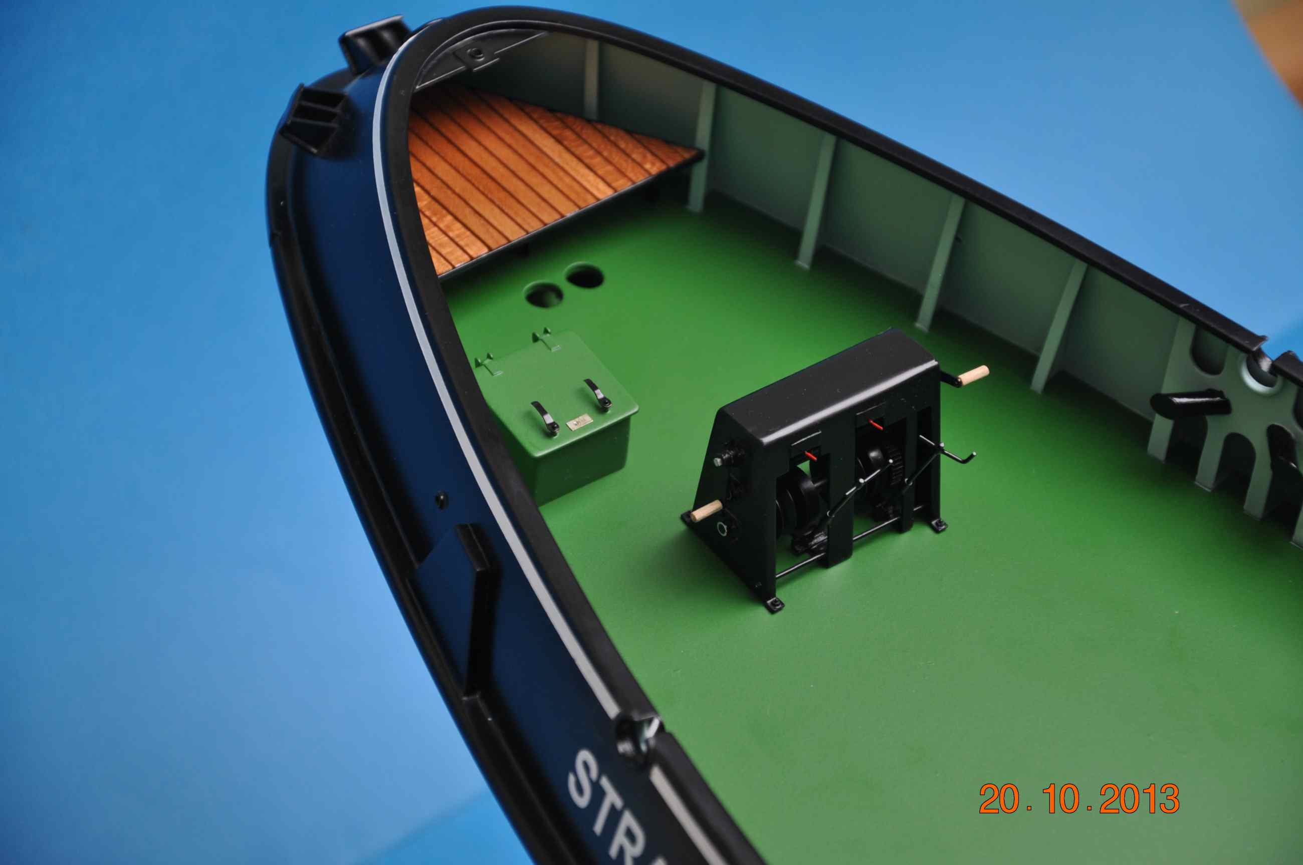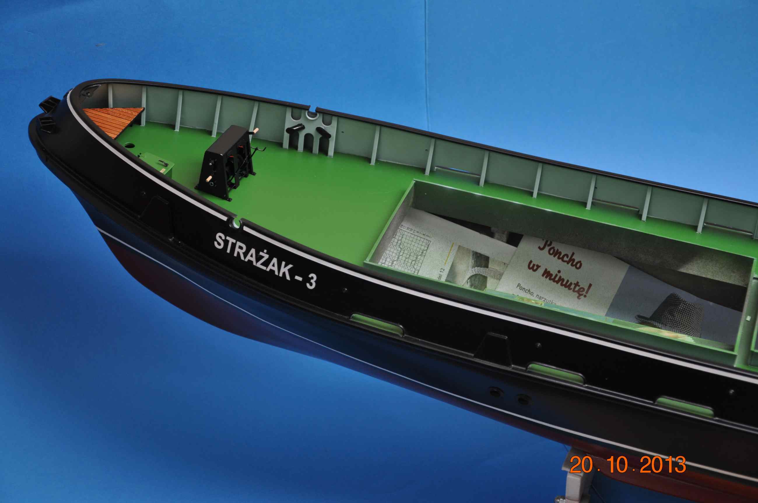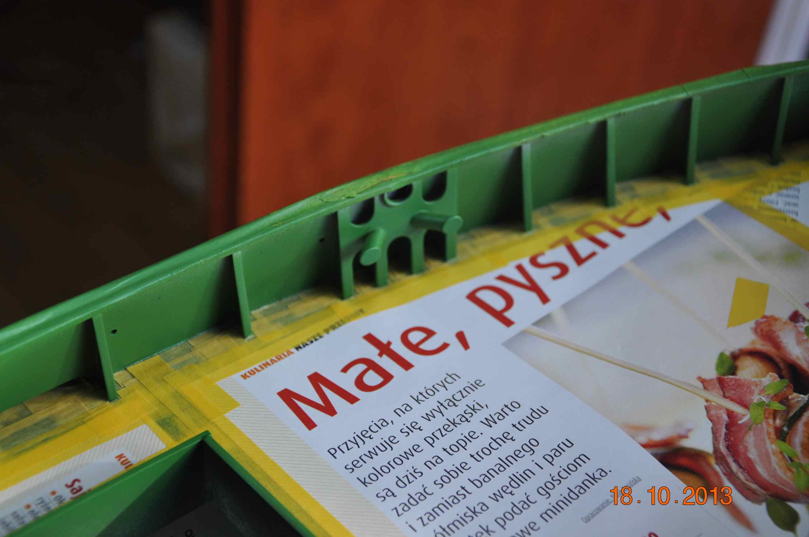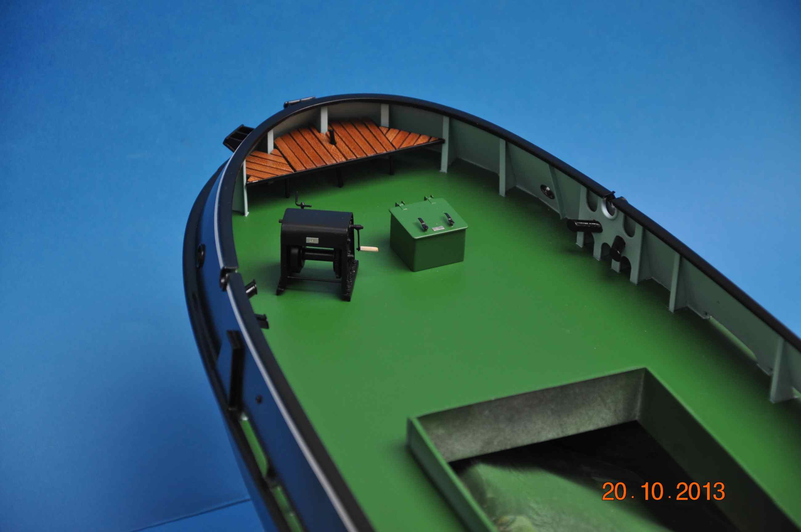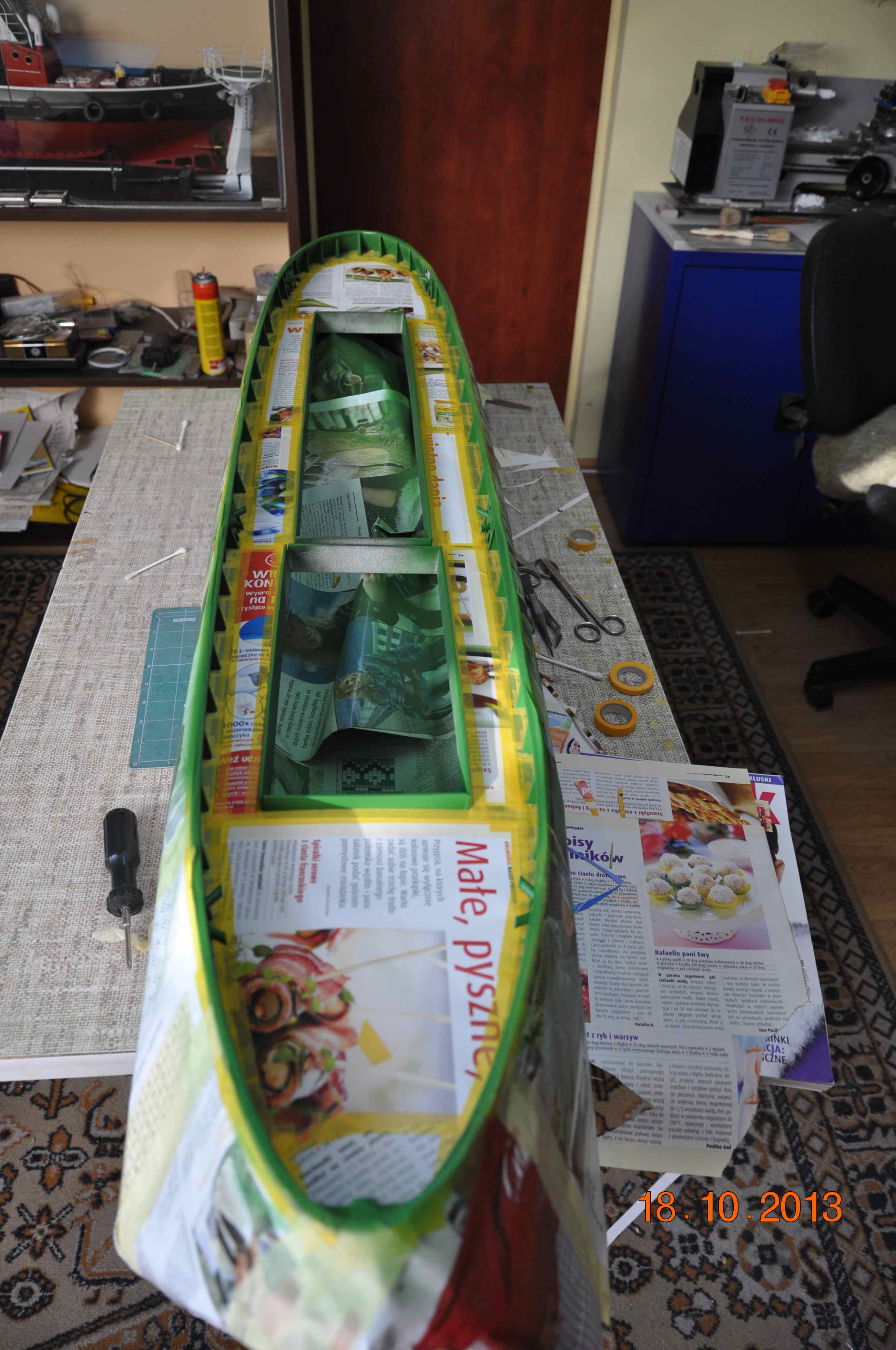 Dziś nadszedł dzień prawdy rozkleiłem maskowanie to co tak mozolnie zaklejałem przez ostatnie dni , nadburcie od wewnątrz pomalowane, za radą kolegi Grzegorza 75 zacząłem używać farbek firmy GUNZE Mr. Color ja do malowania użyłem farbek z Seri C czyli półmatowych akryli rozcieńczałem je w stosunku 1:1,5 przy ciśnieniu na aerografie 1,5 nieodzowne jest malując tymi farbami zakupić oryginalny rozpuszczalnik z opóźniaczem „liveling thinner”i malowanie staje się przyjemnością :lol: żadnych „meszków” paprochów czy niespodzianek 3-4 warstwy które schną w przeciągu 15minut . Do maskowania oczywiście taśma TAMIYA oraz AIZU :!: .