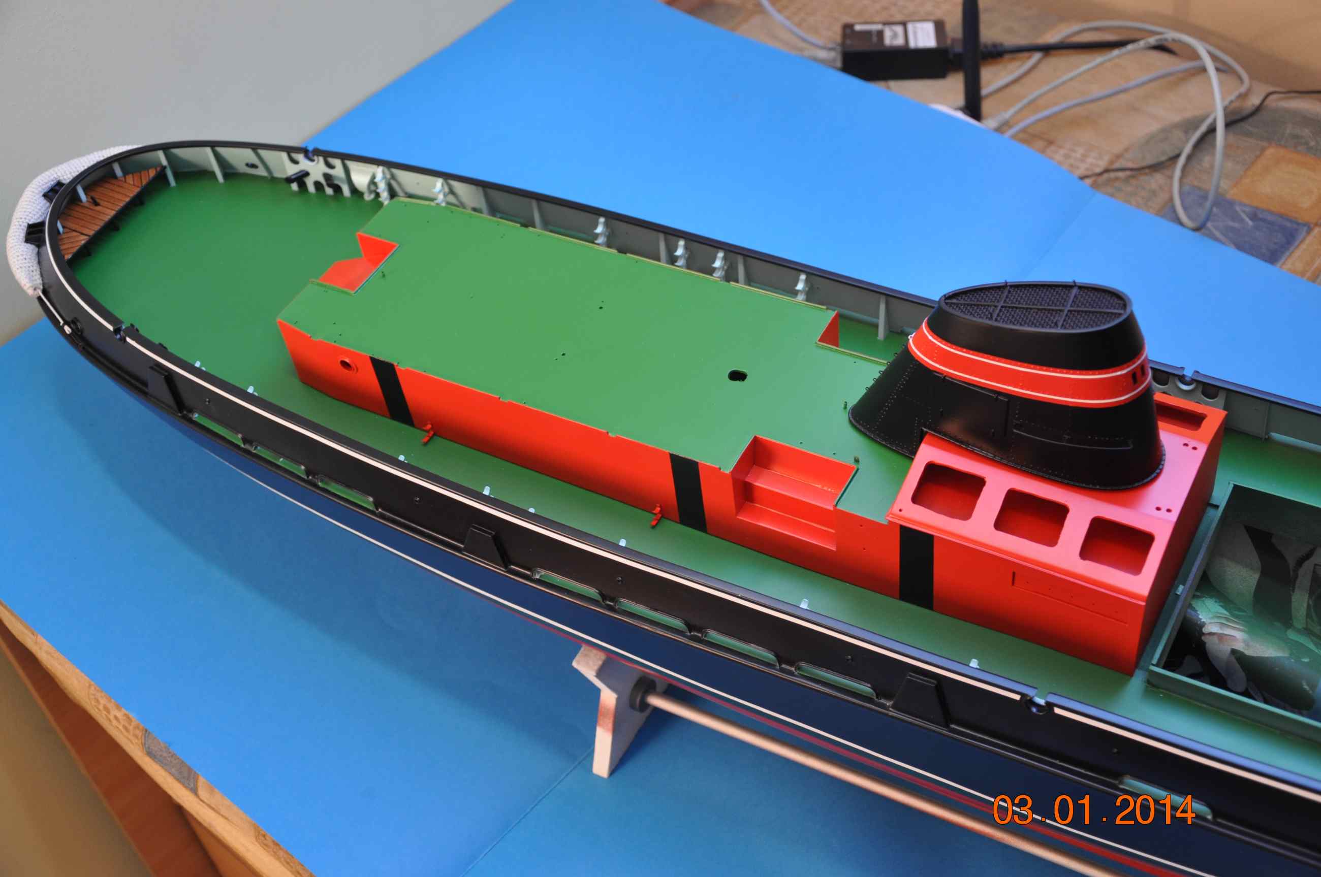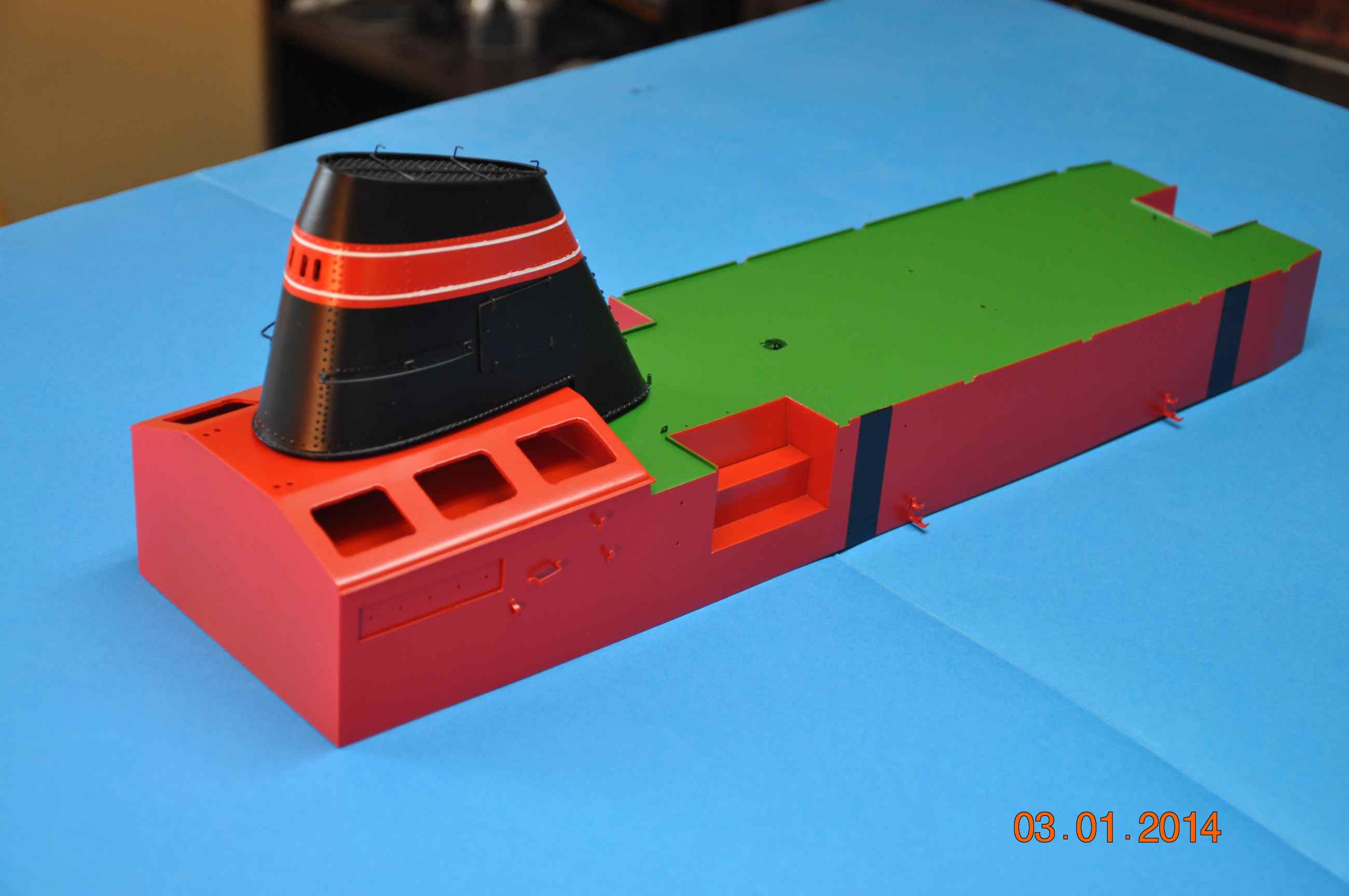 Przyszedł czas na malowanie i montaż elementów rufowa część nadbudówki jest ukończona jak i większość elementów na niej teraz po pomalowaniu zamontowane zostaną wszystkie duperele tak aby już do tego elementu nie wracać , dziś zdjąłem maskowanie i tak to wygląda .