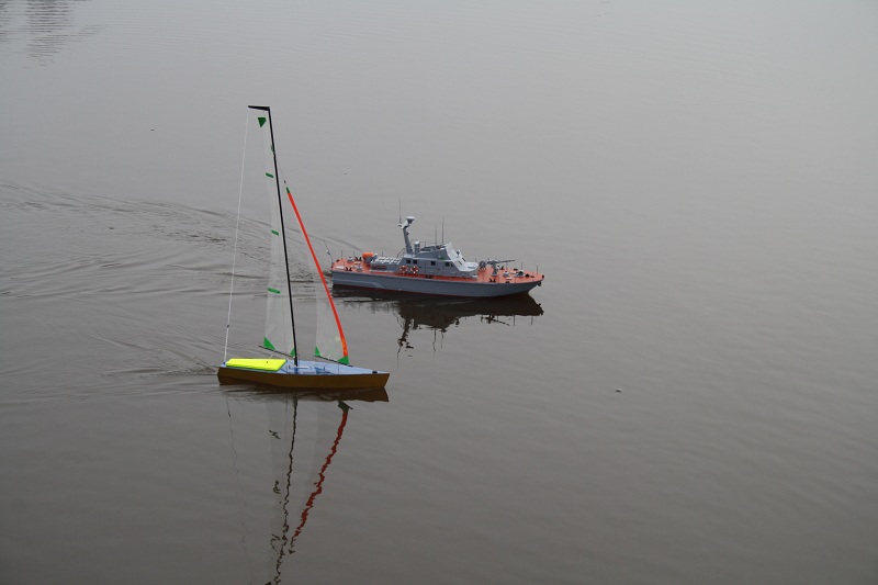 Jeszcze wczoraj w modelarni, ale trudno było tę parę utrzymać na miejscu. Oto dziś Tomka "maszyna w wodzie. Pod żaglami mojego NSS 650 mogłem gonić przy niewielkiej prędkości - nie miałem szans.