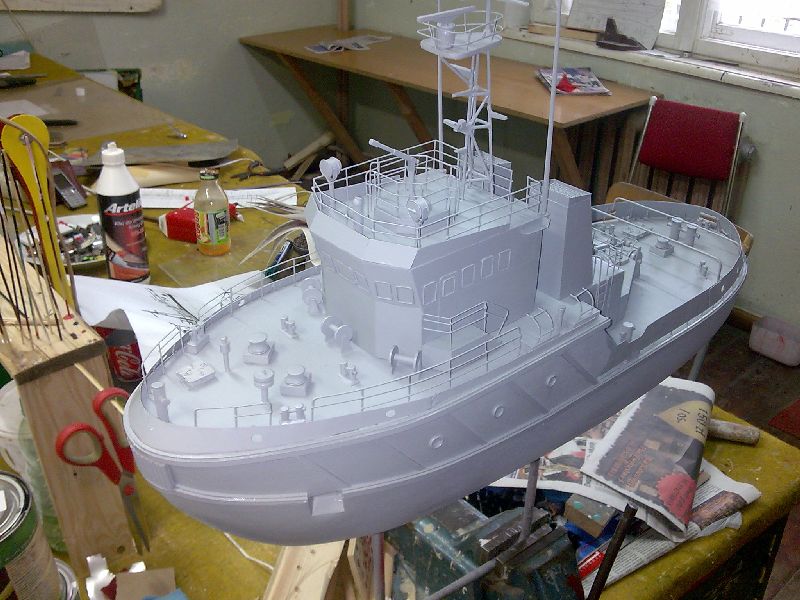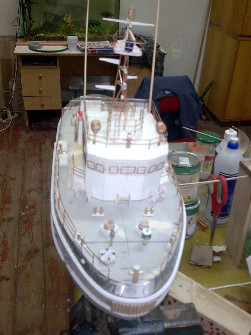 Sam kadłub wykonany był z czterech sklejonych ze sobą sosnowych belek o przekroju 100mmx100mm. Później w ruch poszło dłuto, szlifierki, ścieraki i inne drapiąco-dłubiące sprzęty. Całość pokryta mieszaniną talku i kleju. Zresztą metoda jak przy Pułaskim. Podstawka dosyć solidna bo łajba ważyła z 8 kg. Na widoku od przodu jest krzywa antena i nie jest to błędem bo na prawdziwej jednostce jest taka krzywa (przyszedł raz pan komandor, powiedział że jest krzywa antena, chciał wyprostować i urwał...