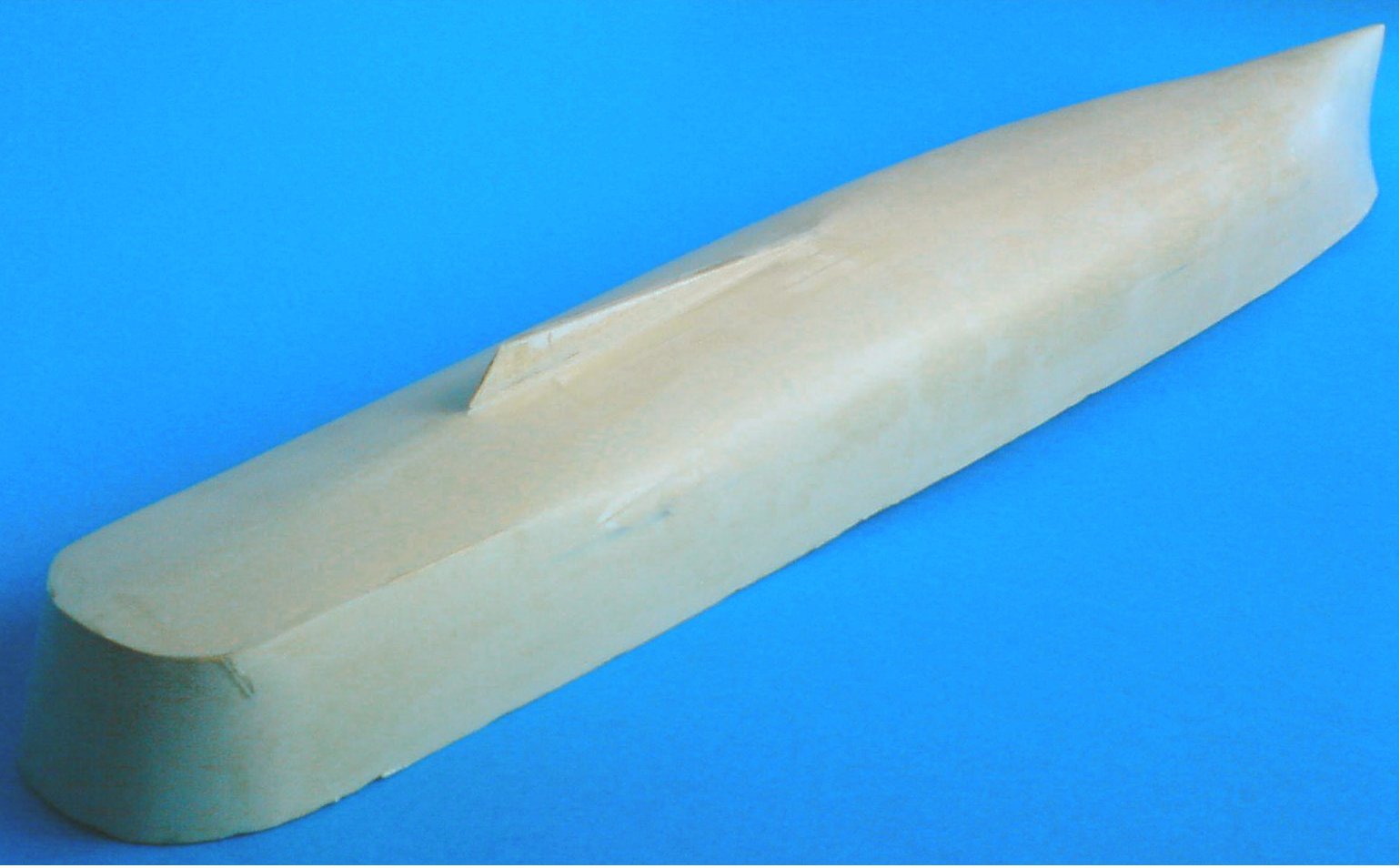 Przygotowany szkielet wypełniłem pianką, którą po wyschnięciu ściąłem i wyszlifowałem do szkieletu uryskując całkiem ładny kształt kadłuba.