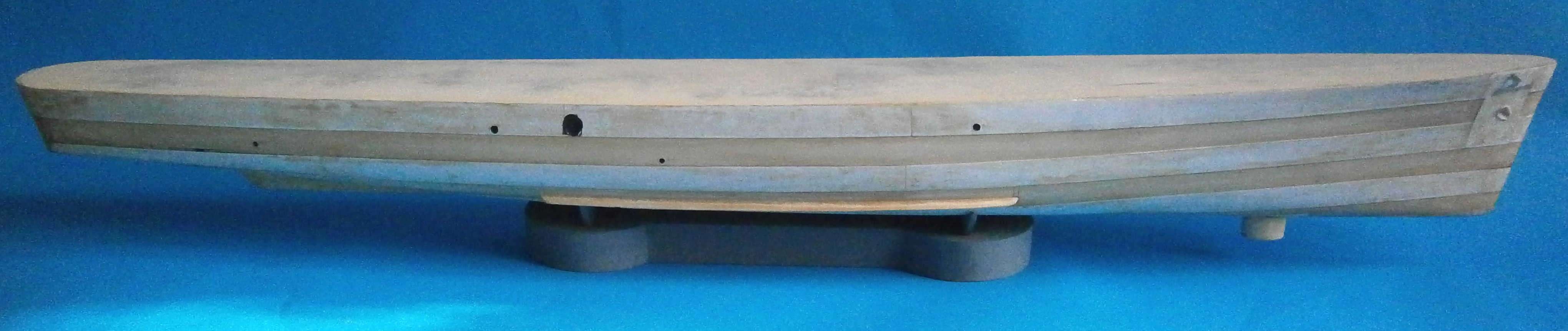 Ostatniego posta pisałem jak byłem na etapie oklejania modelu paskami tektury 1 mm. Następnie potraktowałem model kilkoma warstwami kaponu aby go usztywnić. Potem pokryłem go warstwą szpachli samochodowej (uniwersalnej - w sklepie powiedziano mi, że najlepiej nada się do tego celu, bo jest elastyczniejsza i łatwiej się obrabia niż wykończeniowa). Następnie całość wyszlifowałem i znowu położyłem szpachlę i znowu... aż otrzymałem taki efekt o jaki mi chodziło. Gładki kadłub, bez żadnych niedoskonałości o płynnych, pełnych kształtach.