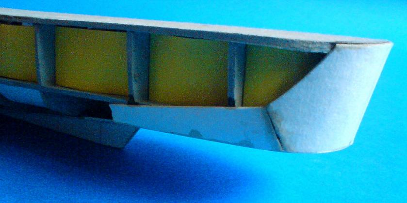 We wcześniejszym opisie pokazałem przygotowany do pokrycia i wypełnienia pianką szkielet. Ponadto wykonałem część poszycia na rufie gdzie powierzchnie burt i dna łączą się ze sobą w formie "kantów". Cały szkielet rozrysowałem o 1 mm węższy niż powinien być po przeskalowaniu z każdej strony oprócz pokładu, dzięki czemu pełny kształt kadłuba był bardzo łatwy do uzyskania chociażby przez naklejenie poszycia zrobionego z tekturki o grubości 1mm.