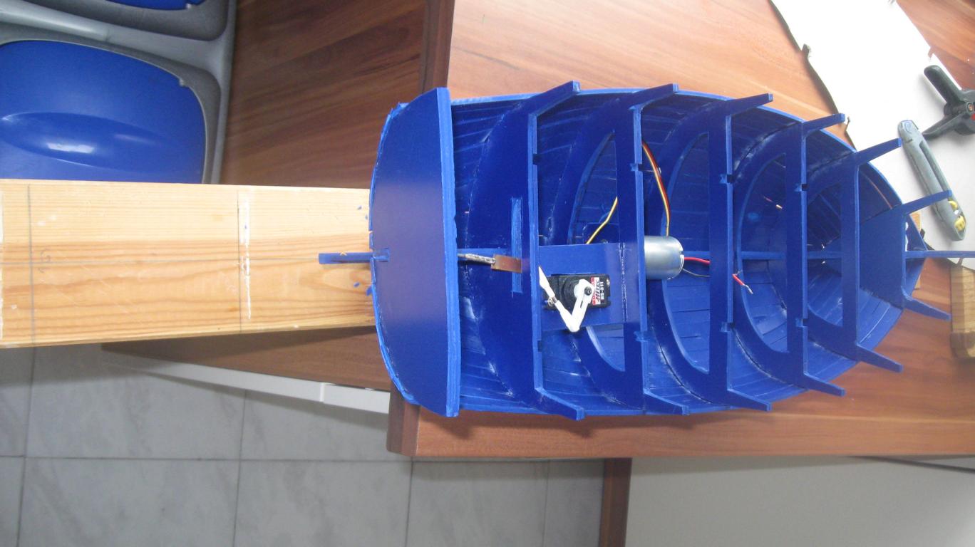 Kadlub okleilem paskami wycietymi z plyty PVC. Nastepnie zamontowalem silnik i ster.