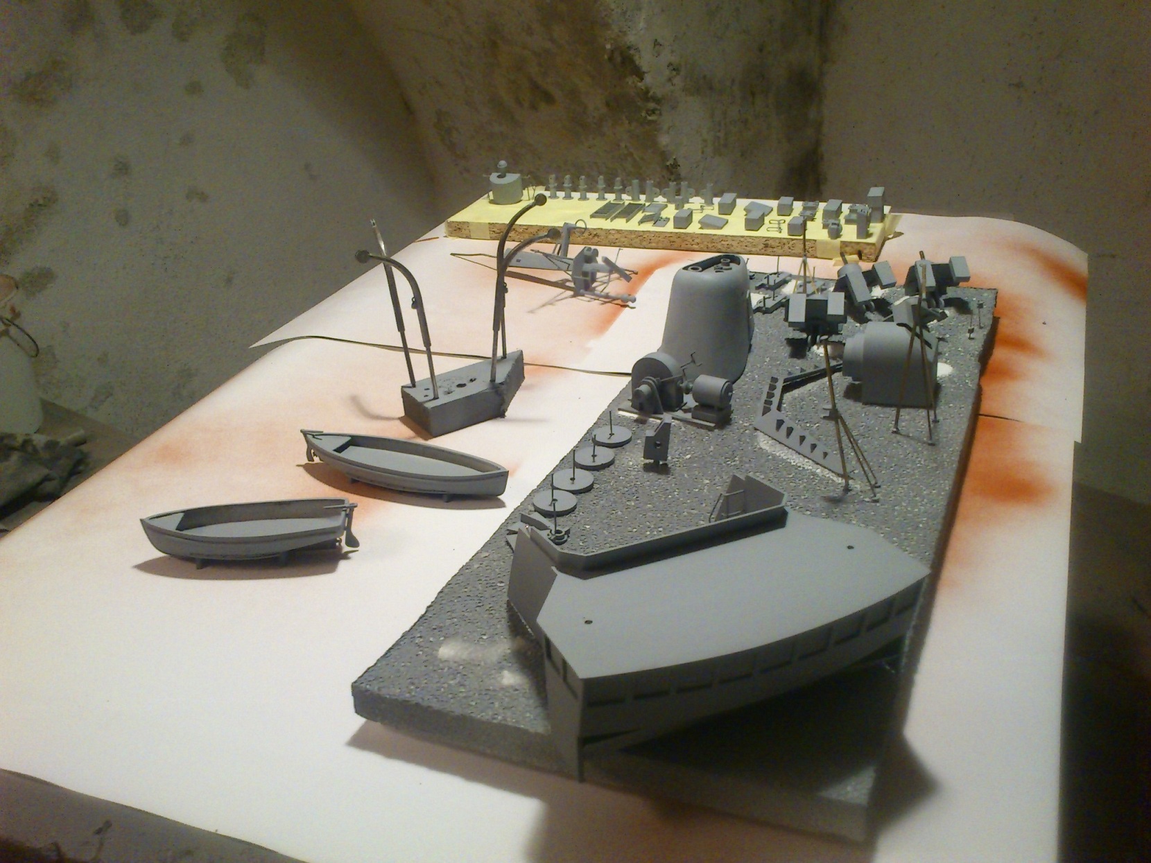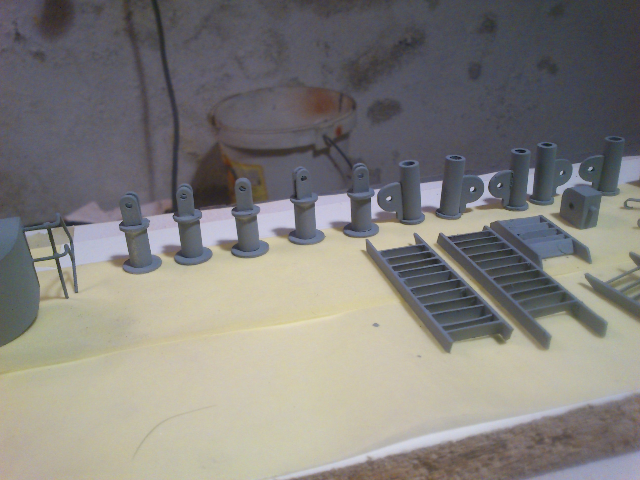 Witam wszystkich. Prace dobiegają końca. Wszystkie elementy już są. Kadłub jest w trakcie malowania, zaś nadbudówka już pomalowana. Malowałem farbami nitro. Nie wystąpiły żadne komplikacje w połączeniu z PCV. Na zdjęciach poniżej widać działka a właściwie ich podstawy tuż przed malowaniem. Już nie długo pokażę zdjęcia skończonego modelu.