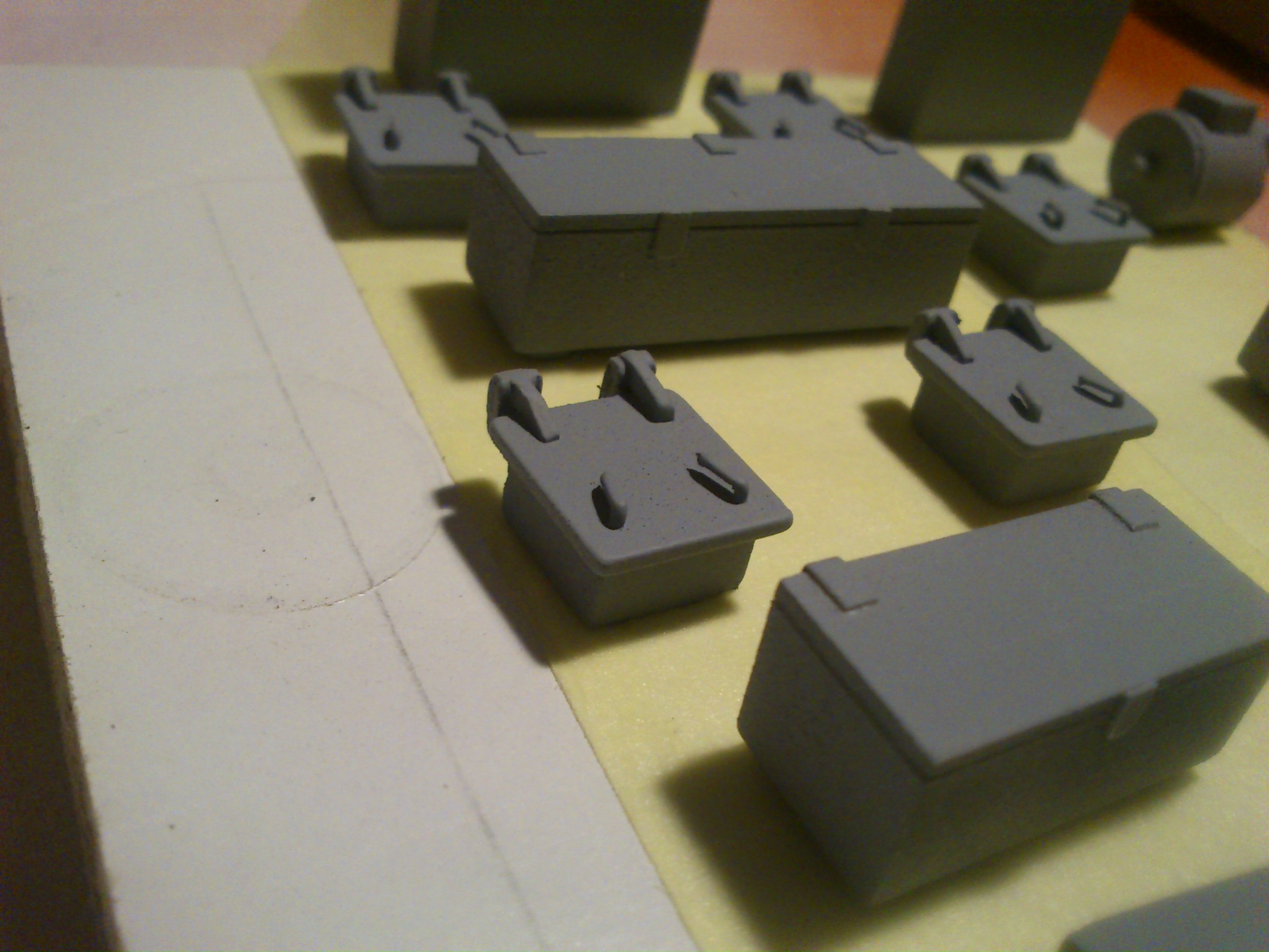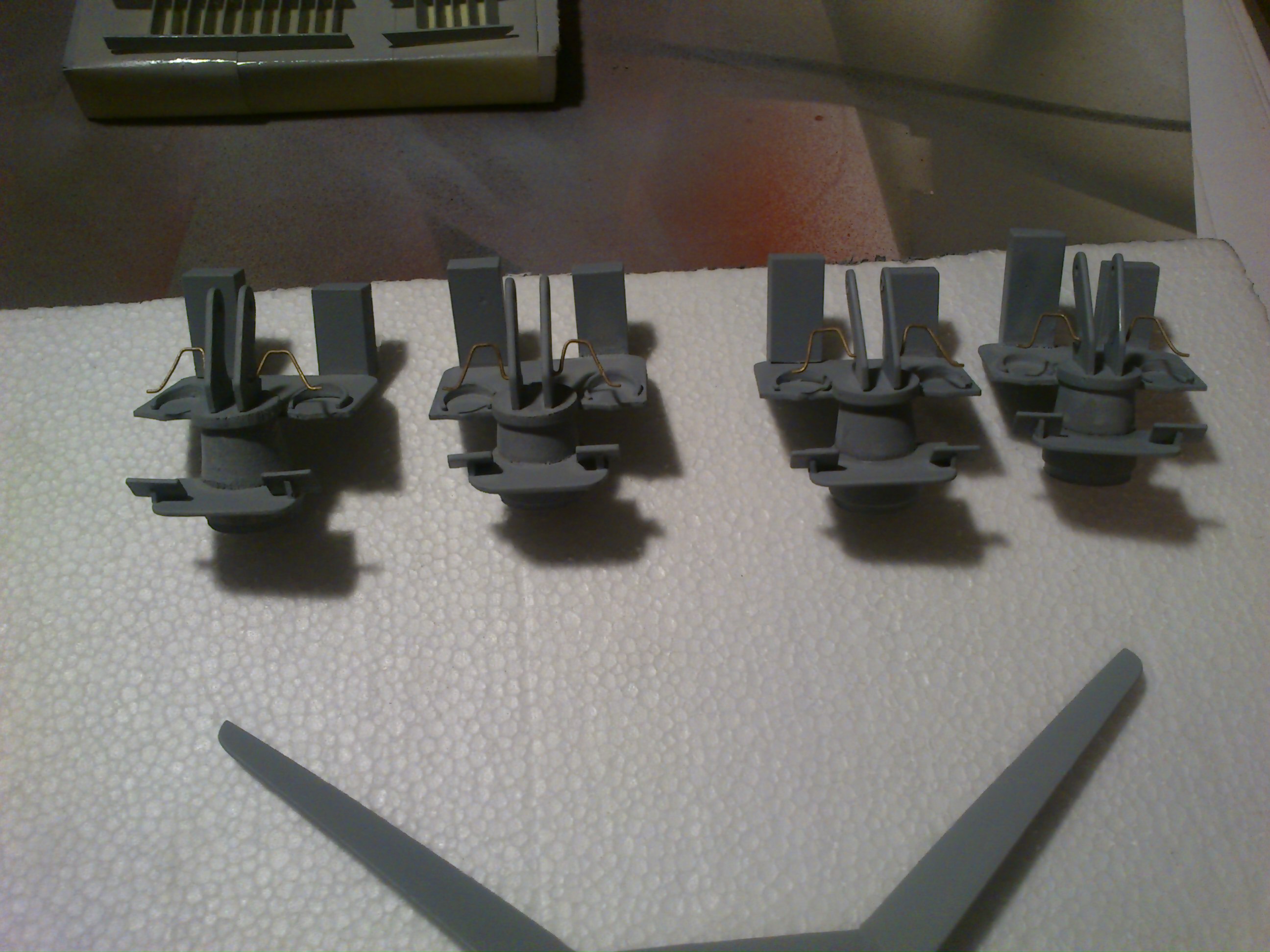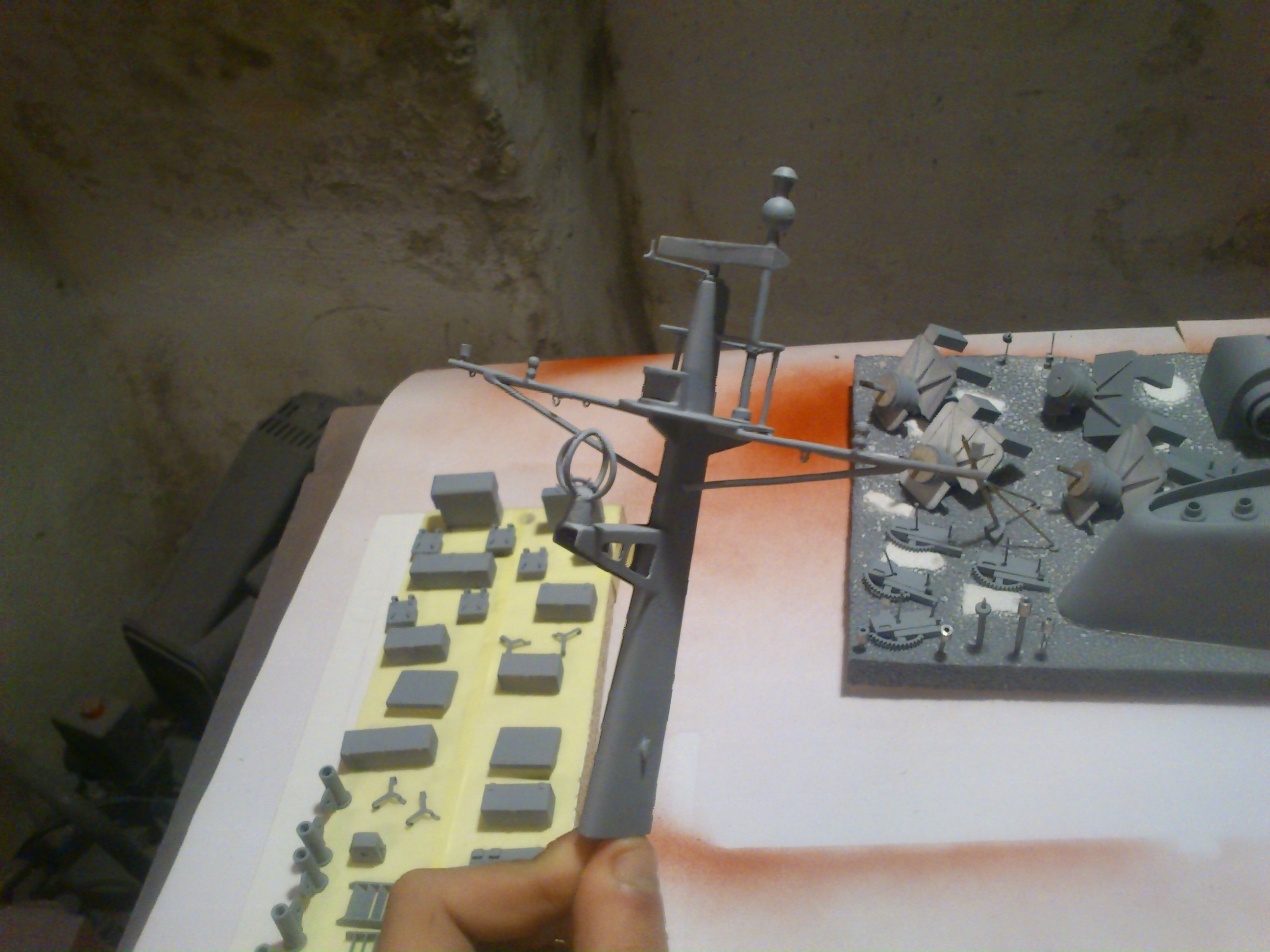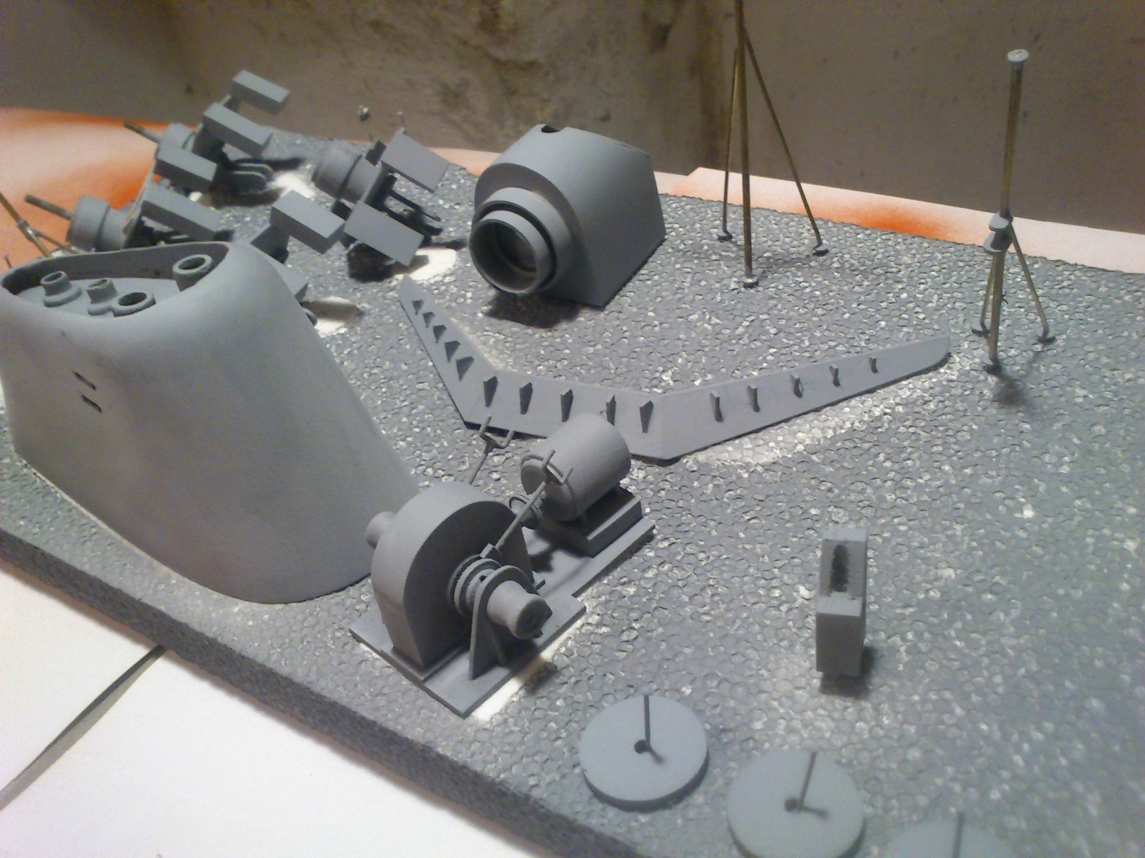 Witam wszystkich. Prace dobiegają końca. Wszystkie elementy już są. Kadłub jest w trakcie malowania, zaś nadbudówka już pomalowana. Malowałem farbami nitro. Nie wystąpiły żadne komplikacje w połączeniu z PCV. Na zdjęciach poniżej widać działka a właściwie ich podstawy tuż przed malowaniem. Już nie długo pokażę zdjęcia skończonego modelu.