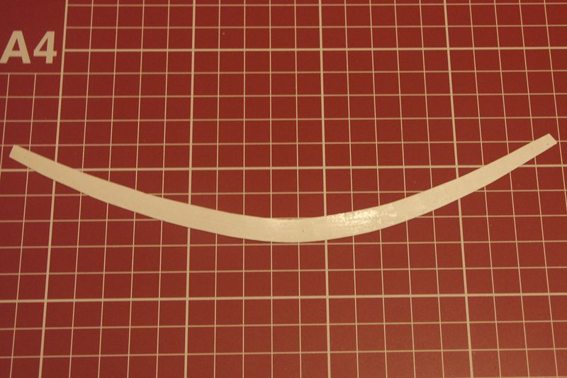 Kolejnym etapem było przyklejenie poziomej listwy relingowej ( tej na której będzie mocowany reling). Wycinałem fragmenty z rzutu poziomego, naklejałem na plastyk i wycinałem ostrym skalpelem. Kleiłem również bez pośpiechu. Po przyklejeniu całości byłem nieco zdziwiony, że pasek o szerokości ok. 0,5 mm bardzo wzmocnił sztywność całego nadburcie.