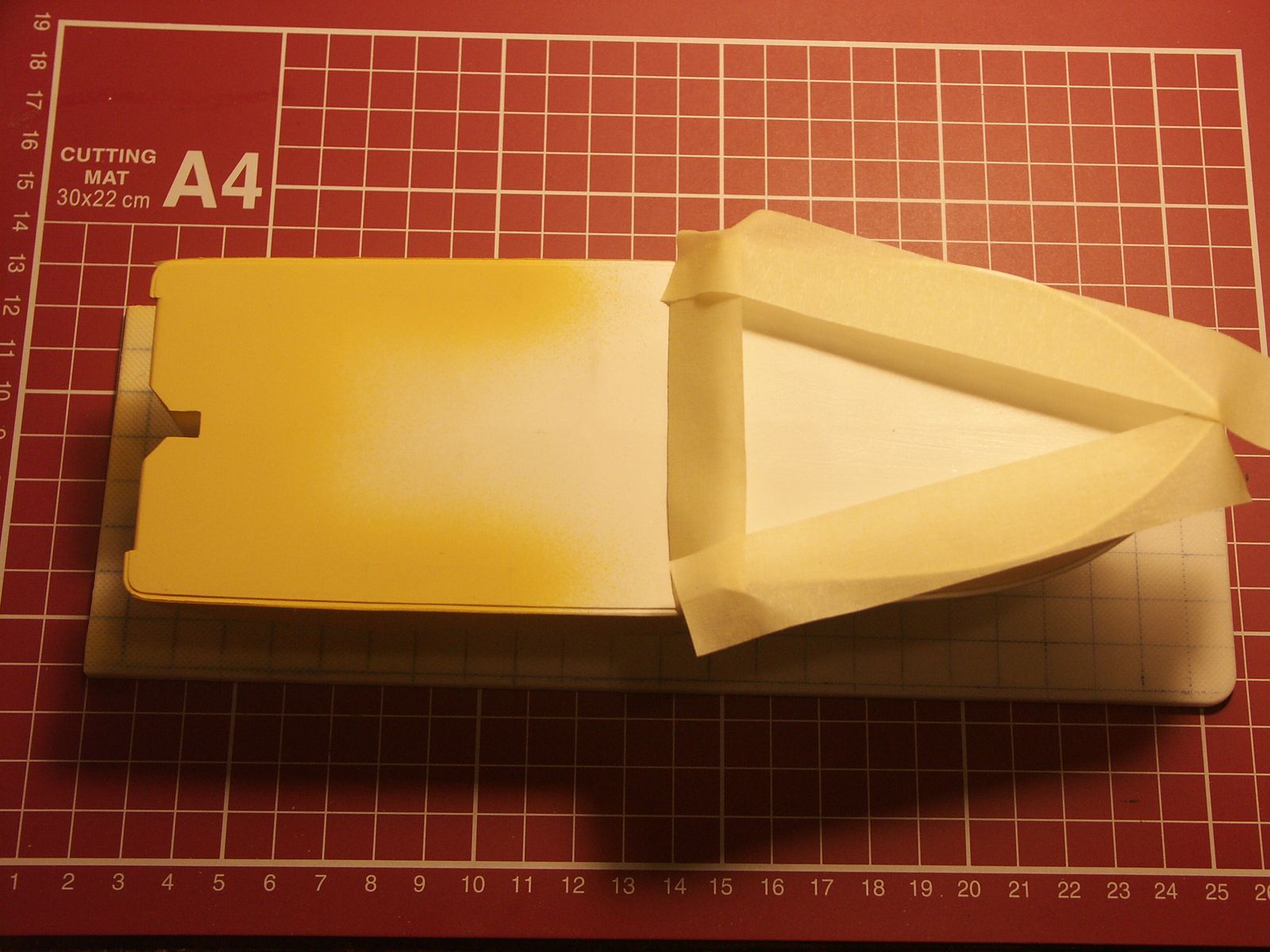 Malowanie czas zacząć. Nadburcie od wewnątrz na dziobie pomalowałem na biało, ale nie będę tego pokazywał bo na tle białego plastyku i tak nic nie widać. W miejscach gdzie będą żółto-czarne pasy ostrzegawcze położyłem kolor żółty. Po przeschnięciu i zamaskowaniu tu i tam pomaluję pokład na zielono.